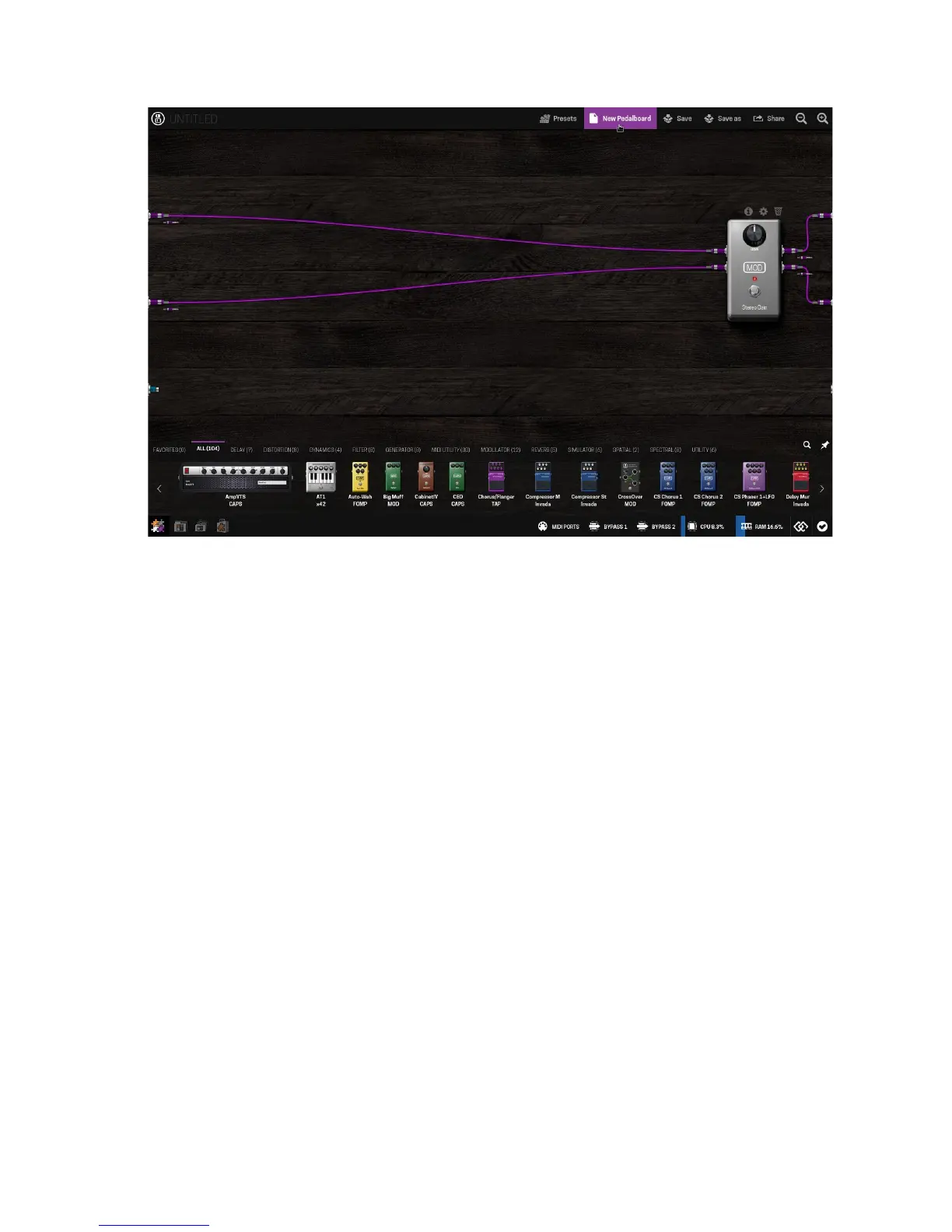 To add plugins, drag-and-drop one from the plugins bar to the pedalboard assembler area.