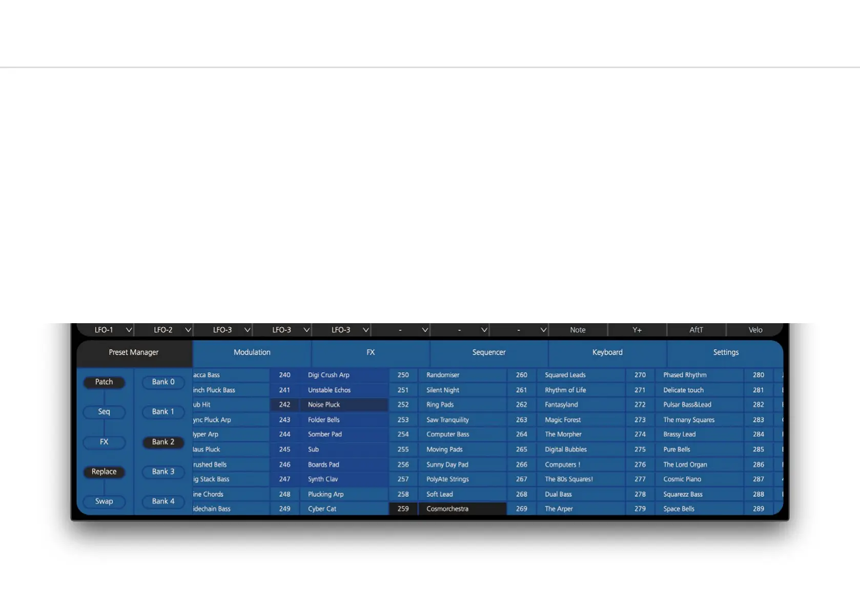 There are 100 presets per bank that can be viewed by scrolling in the preset list.