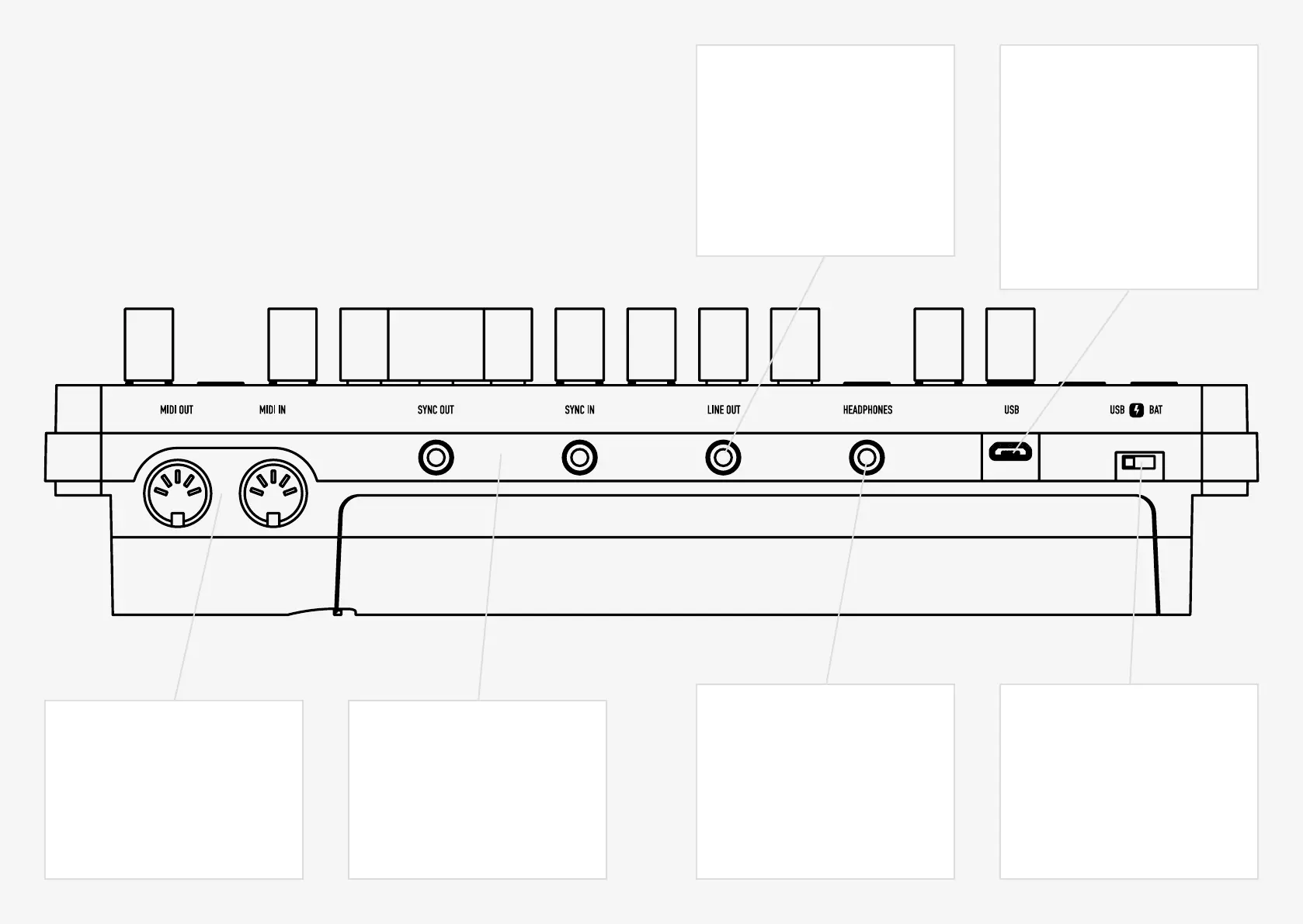SKULPTsynth SE has seven external connections: USB, Line out, Headphones out Clock Sync In,