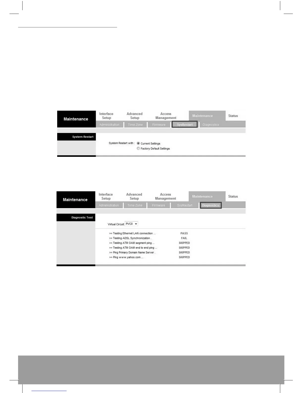 The SysRestart screen allows you to restart your router with either its current settings still in place or the factory de-