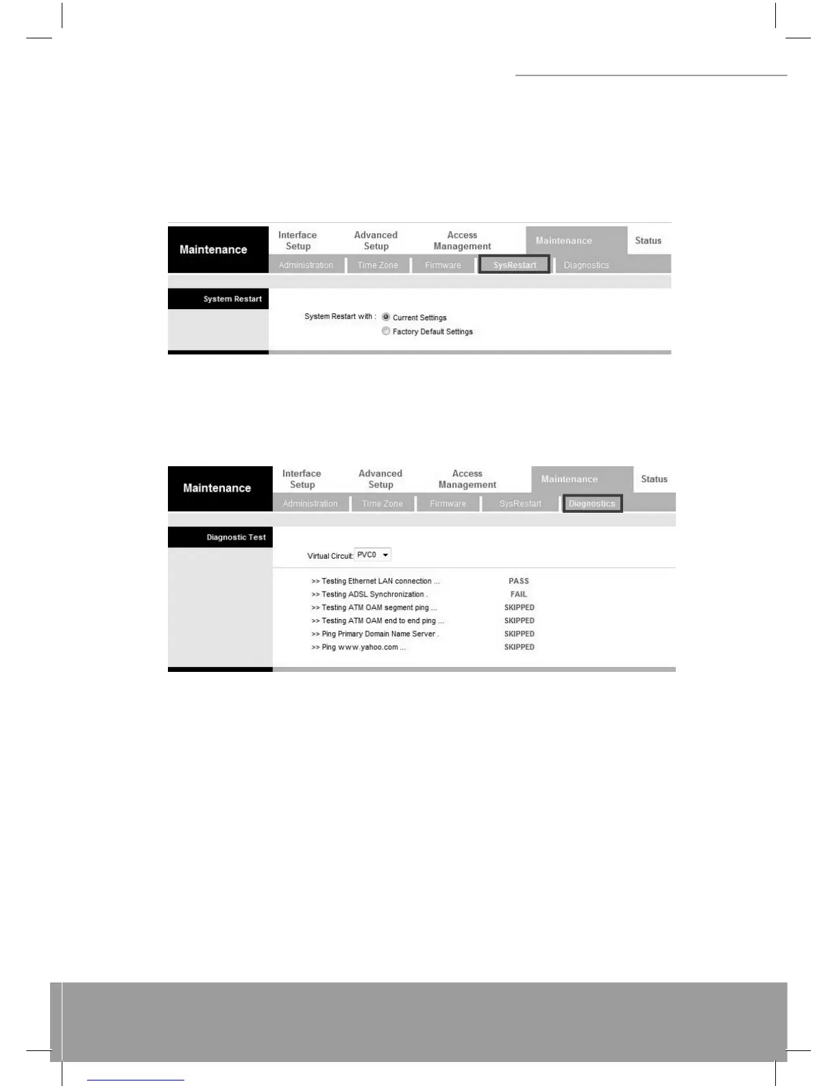 Uwaga: 1) Użytkownik może widzieć TYLKO kontrolne połączenie diagnostyczne PVC0. 2) „Testing ADSL