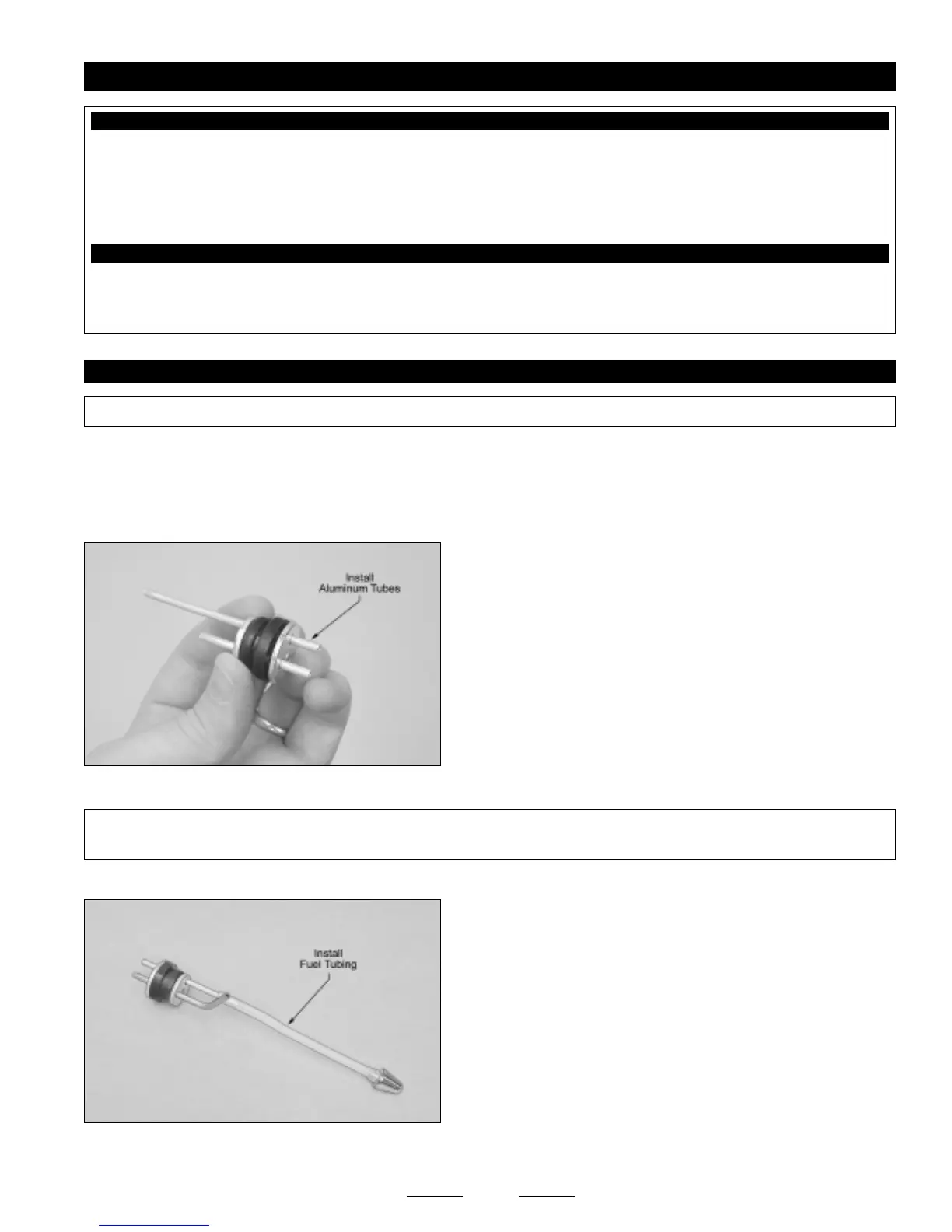 ❑ Using 220 grit sandpaper, carefully smooth and deburr each end of the two aluminum tubes. This will prevent the fuel tubing