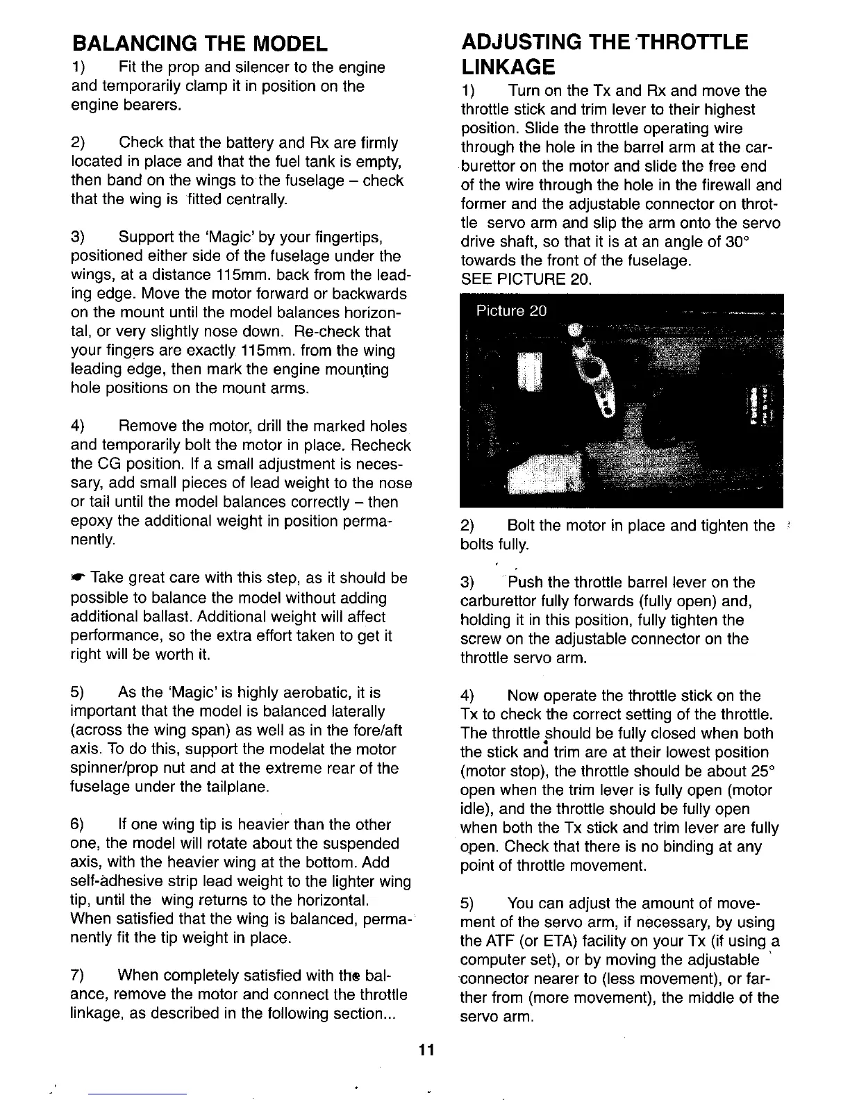 Model Tech Magic - Model Balancing and Throttle Linkage; Balancing the Model (Center of Gravity); Throttle Linkage Adjustment