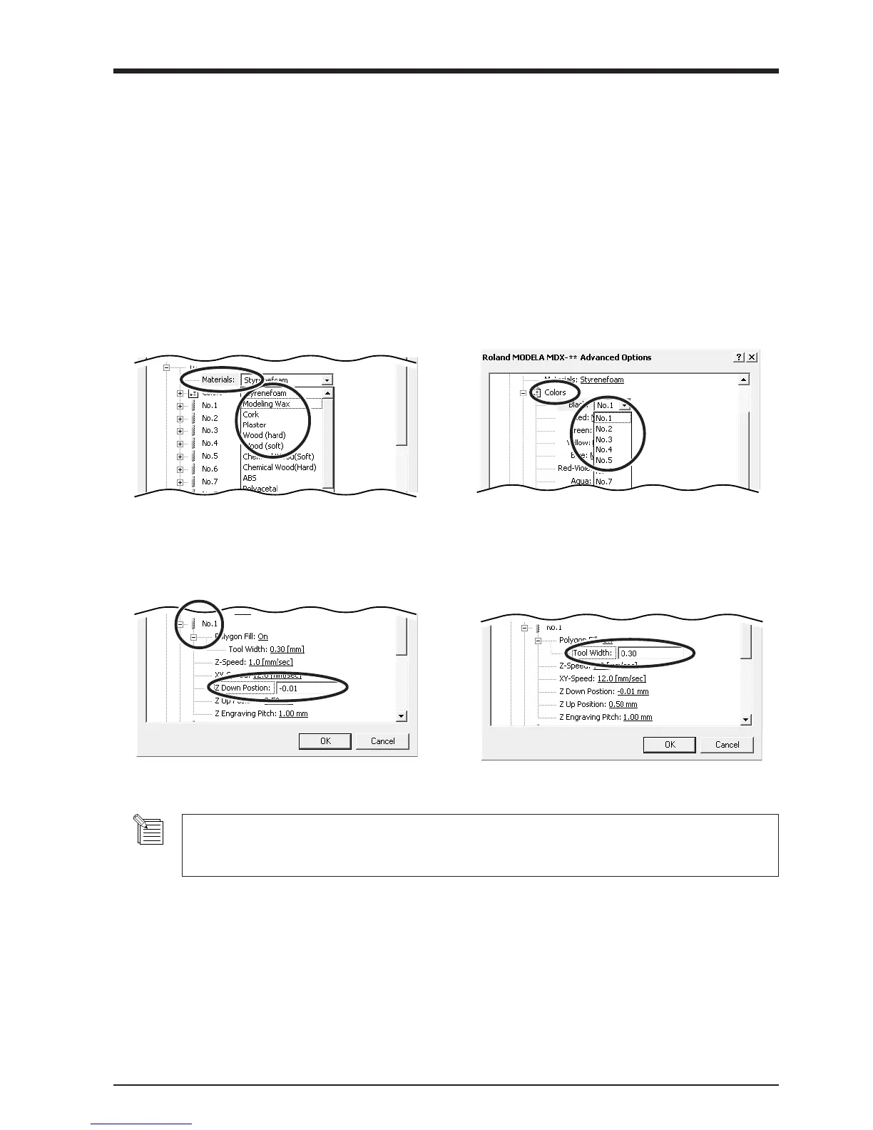 The values for settings other than [Tool Down Position] and [Fill] - [Tool Width] are also suggested guidelines. If the results of actual