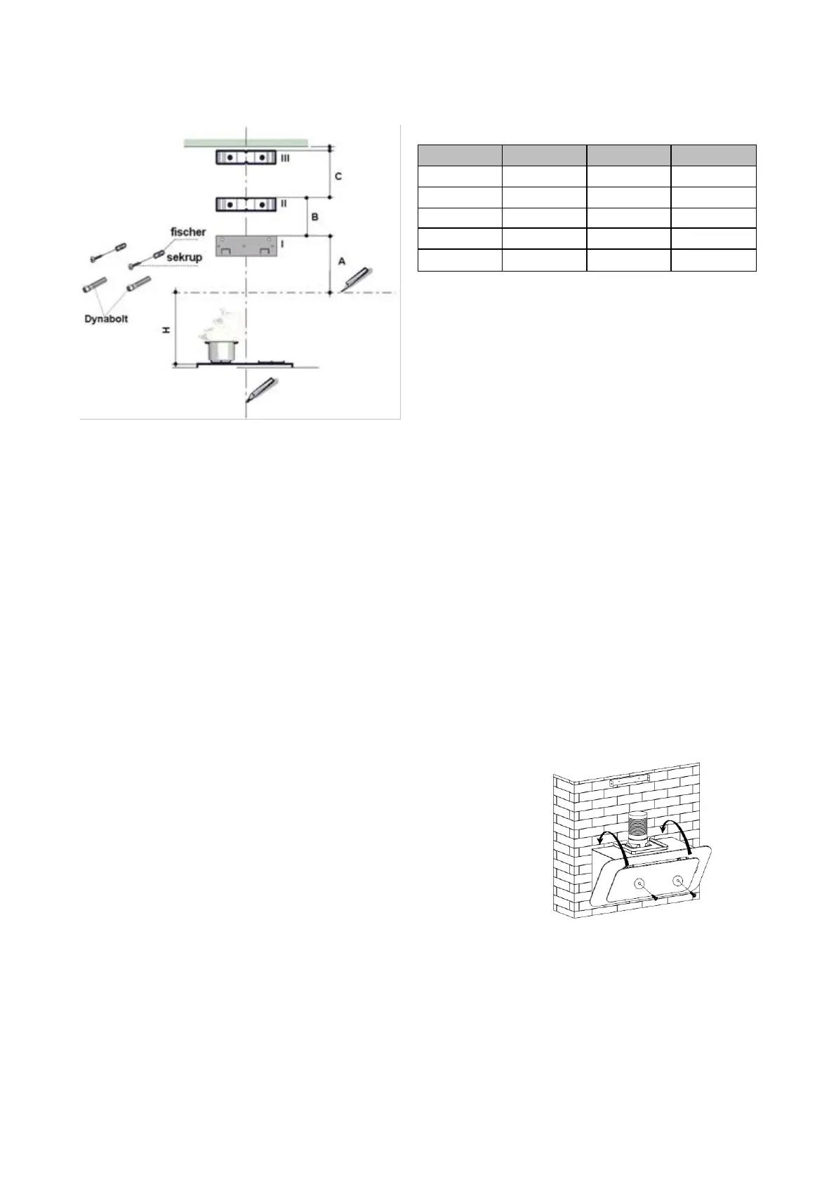 - Install bracket III on the wall just like in the above picture up to height C and mark the holes for fischer