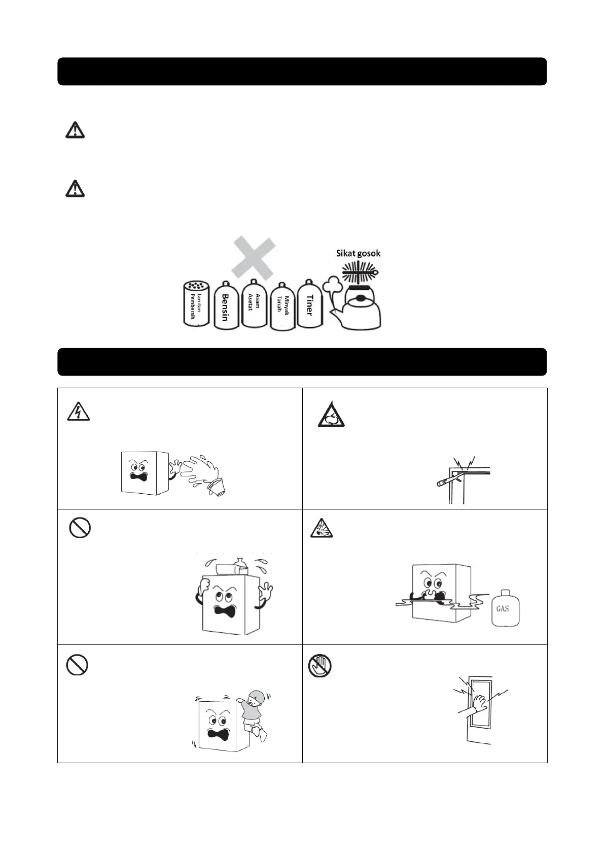 Jangan gunakan bubuk pemoles, bubuk sabun, bensin, minyak atau air panas karena ini akan
