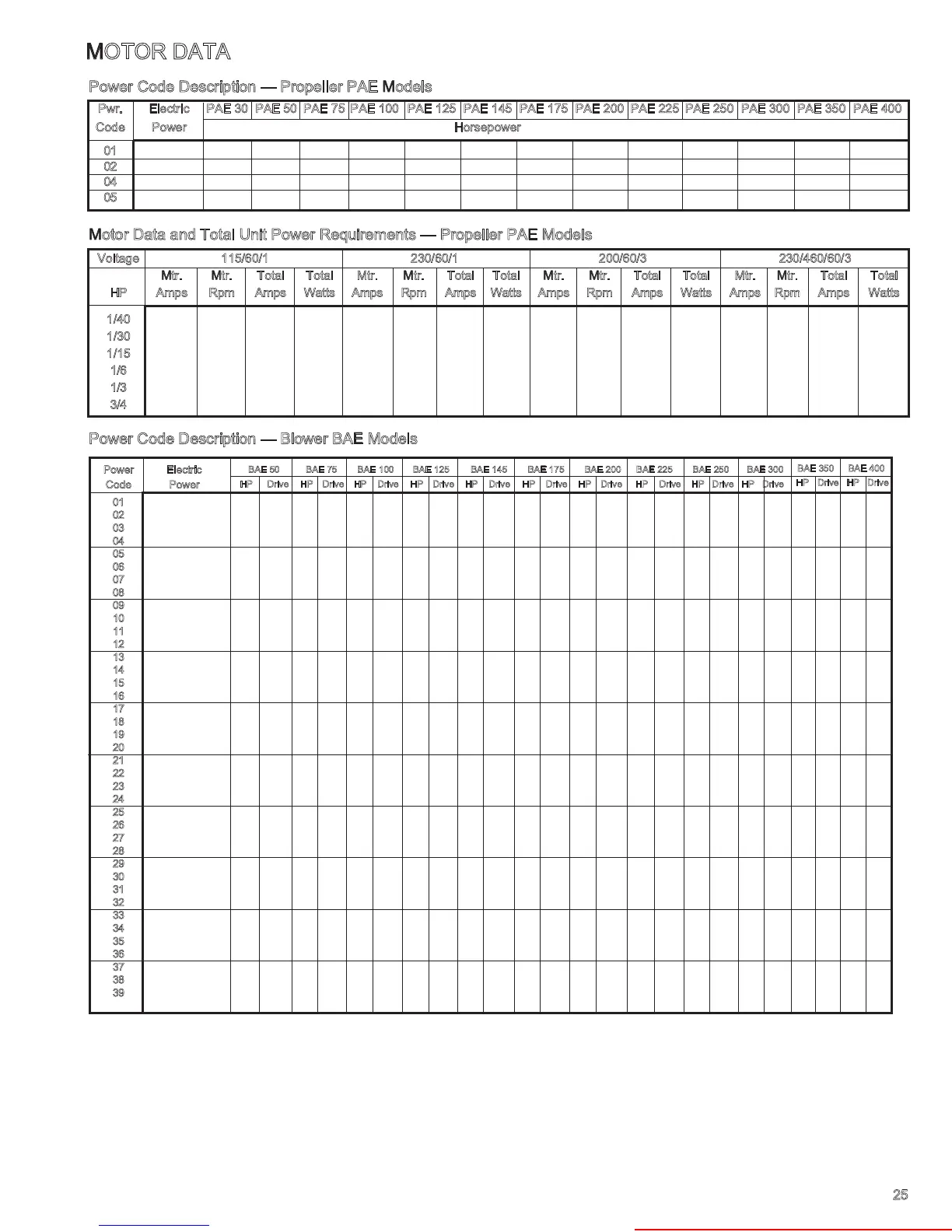 Shaded pole motors on models PAE 30 through PAE 125 – permanent split capacitor motors on models PAE 145 through PAE 400.