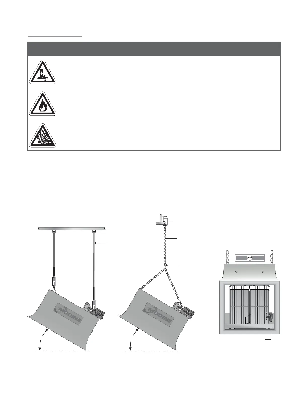 The heater can be suspended with chains or rigid threaded rod. Local codes or conditions that would cause