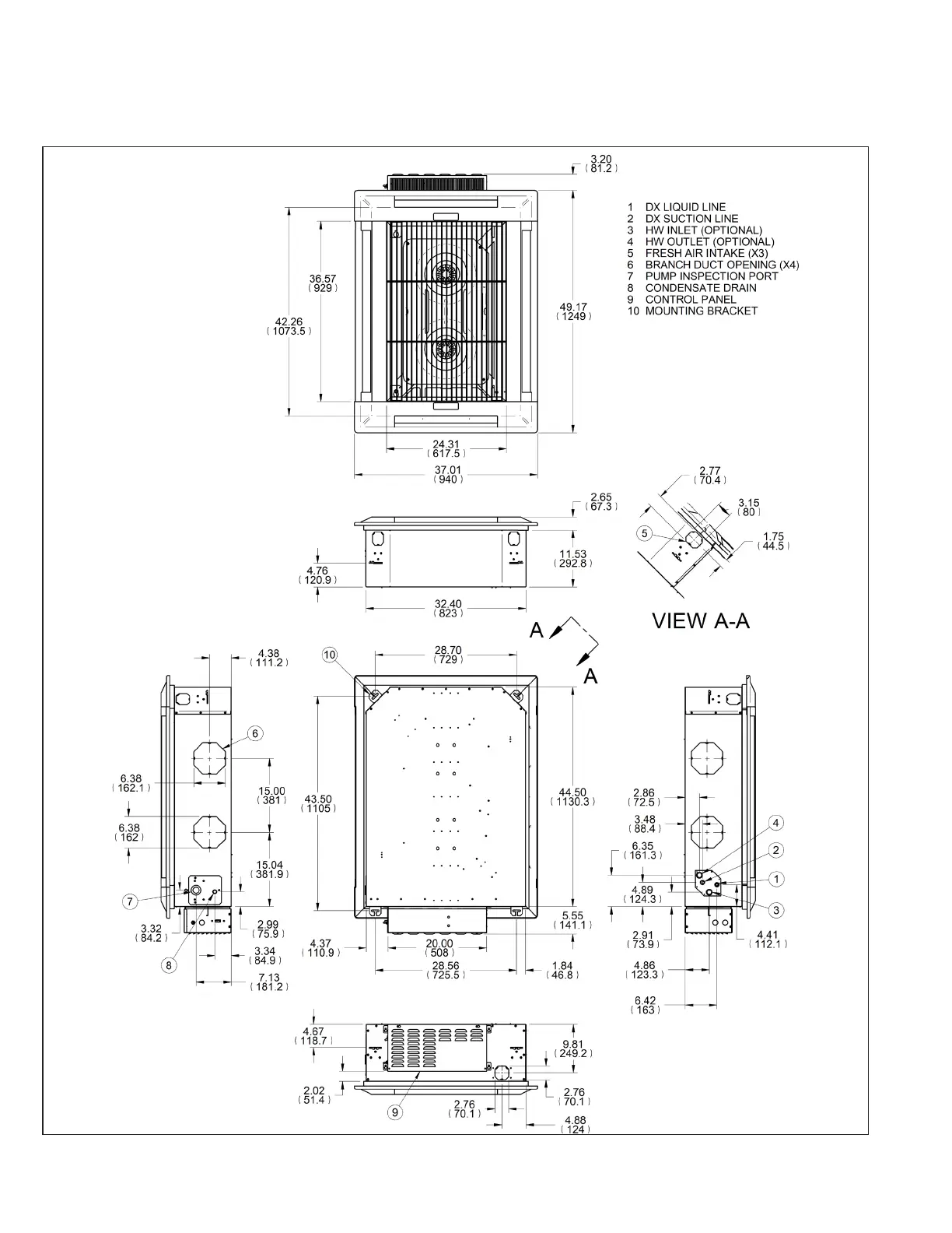 Figure 24.1 - Dimensions – Large Chassis: DX and Heat Pump units – Size 30, 36, and 42