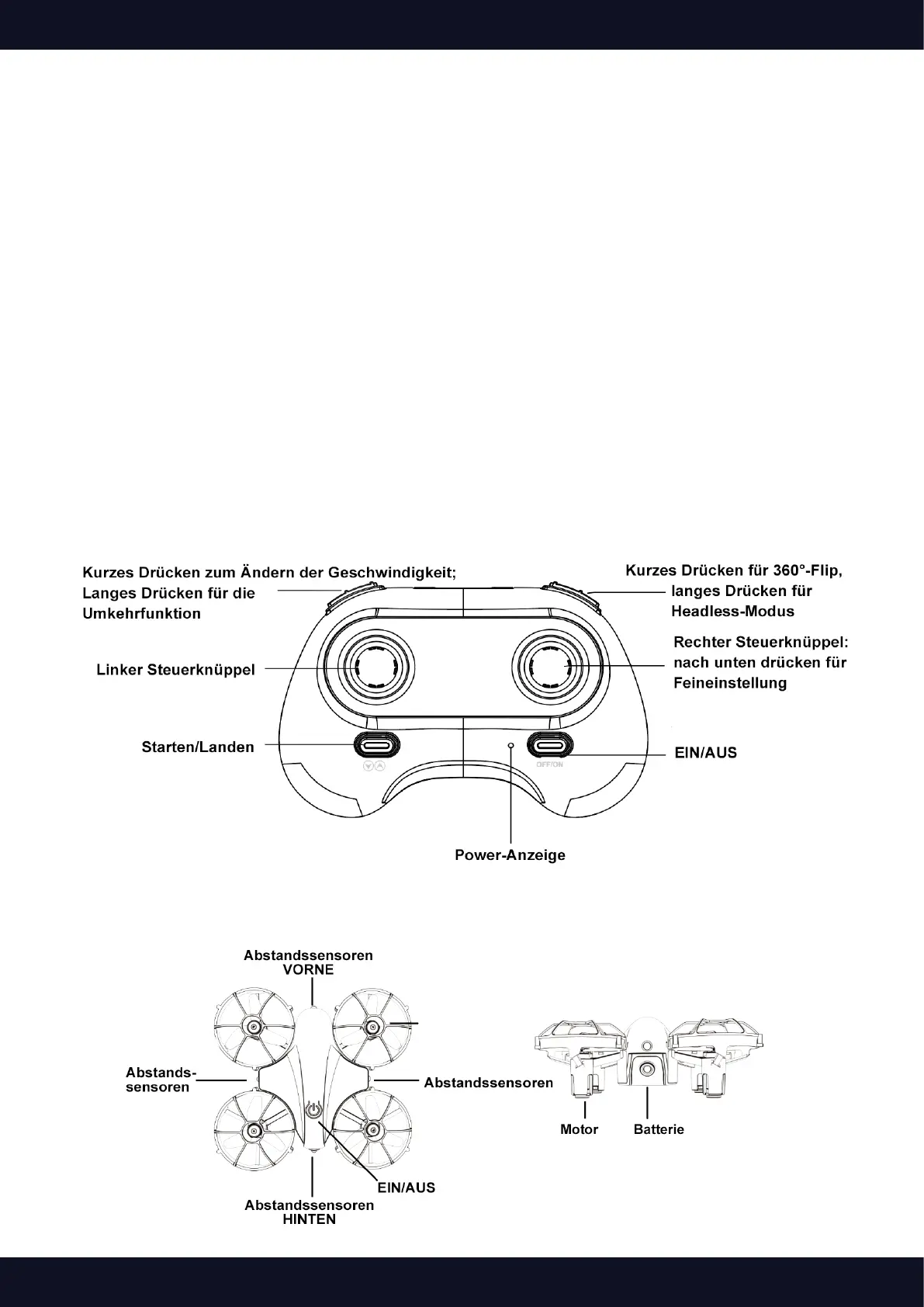 Hinweis: Halten Sie die Taste „Starten/Landen“ 3 Sekunden lang gedrückt, für eine Notabschaltung.