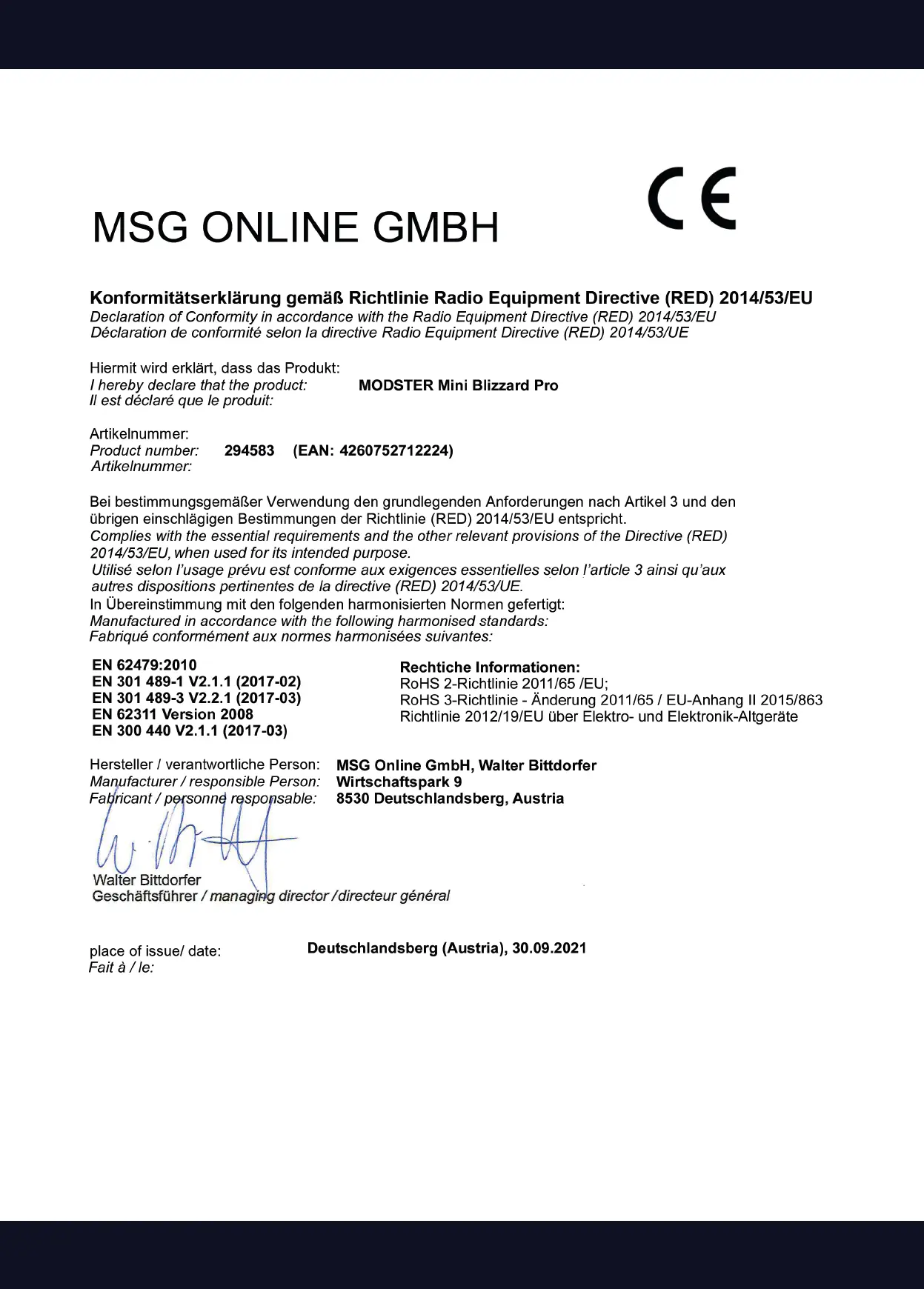 MODSTER MINI BLIZZARD PRO - Declaration of Conformity; Manufacturer Information; Conformity Statement