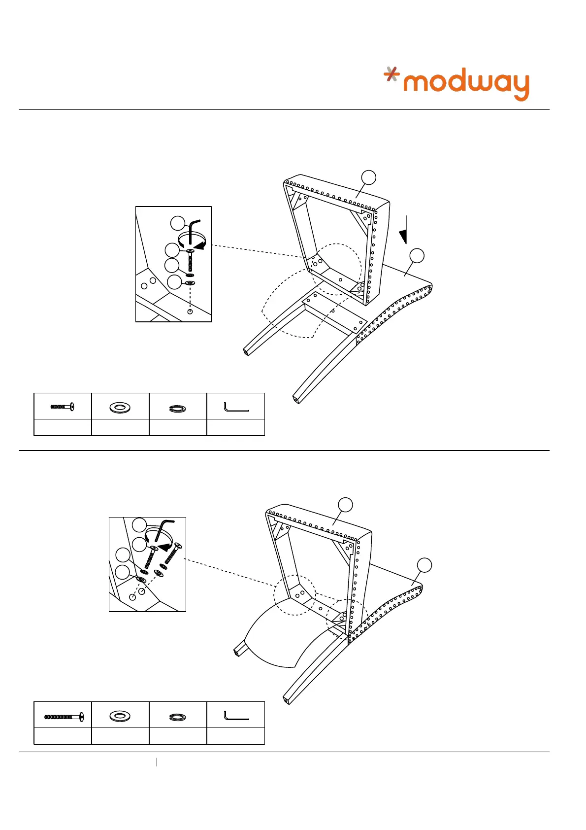 Attach Seat Frame (2) to Chair Back (1) by 4 pieces of Bolt (C), 4 pieces of Spring Washer (E) and 4 pieces of