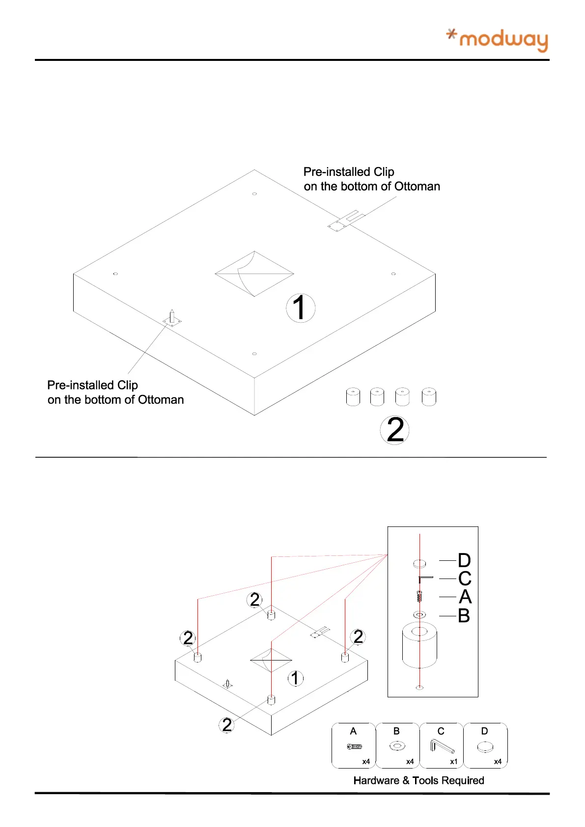 1. Attach 1 piece of Leg (2) to the bottom of Ottoman Body (1) by using 1 piece of Bolt (A) and