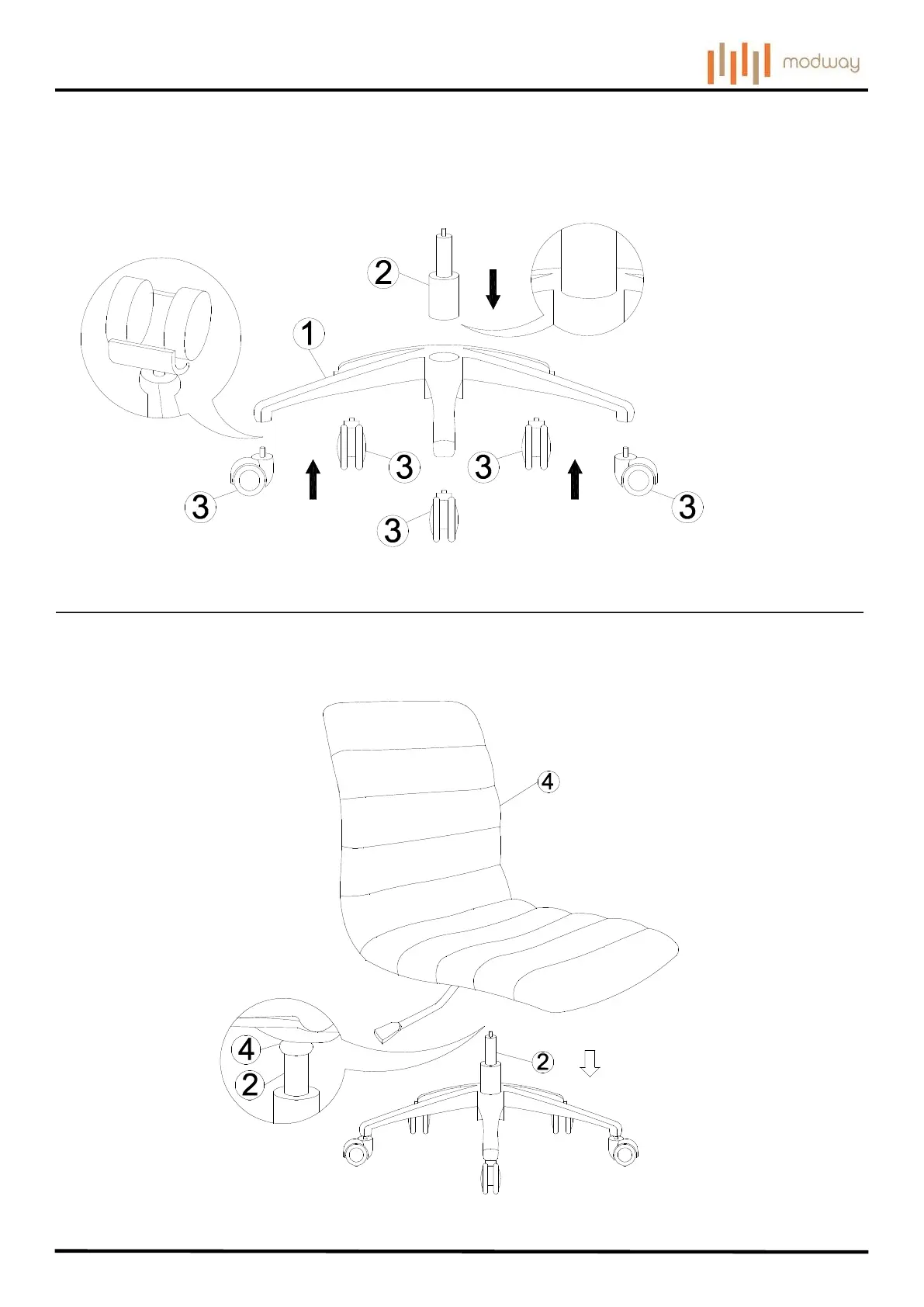 2. Insert 5 pieces of Castors (3) into the Base (1) as shown by hand.