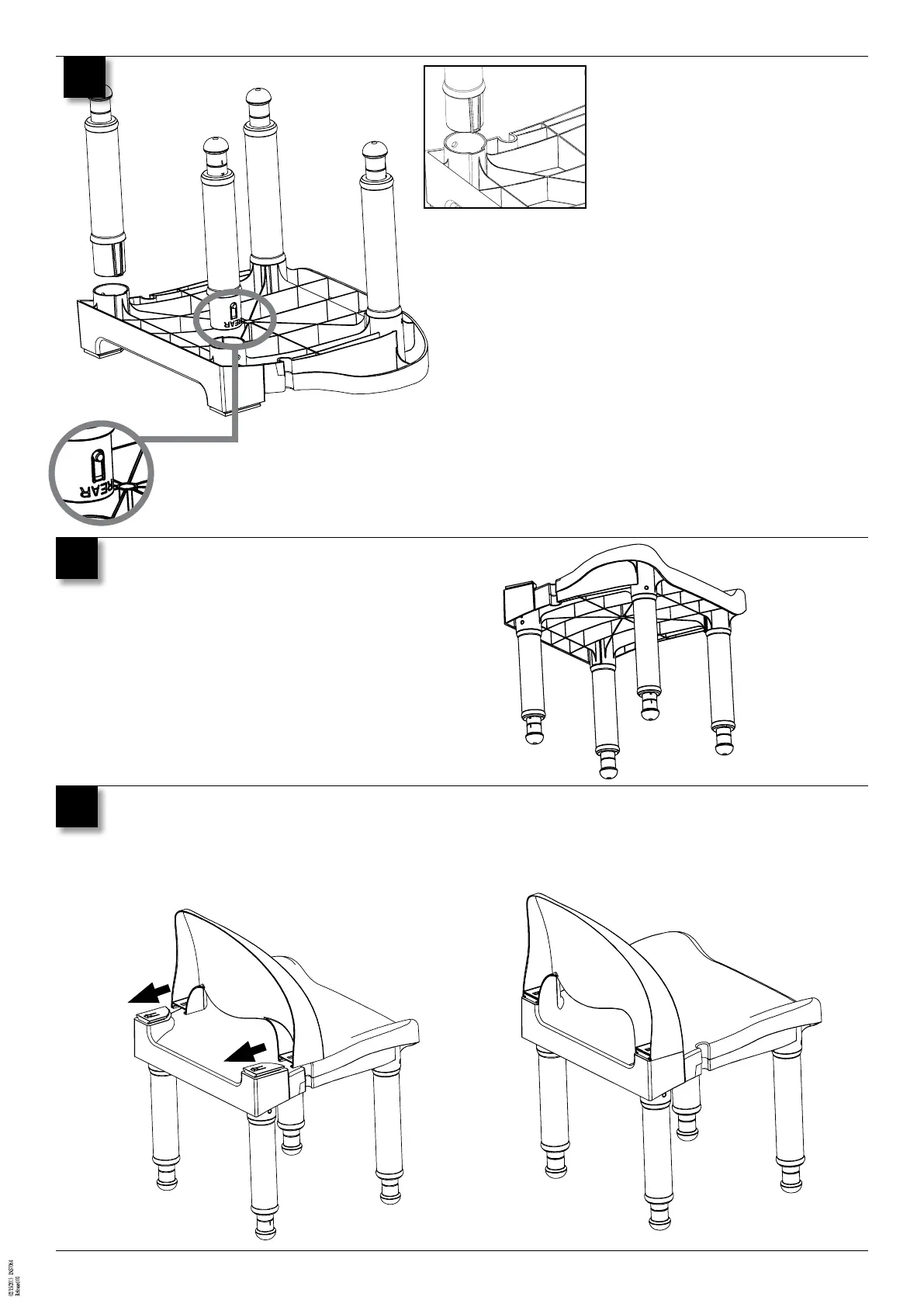 Nota: Las patas y el asiento tienen las marcas “front” (parte delantera) y “rear” (parte trasera) para facilitar la ubicación.