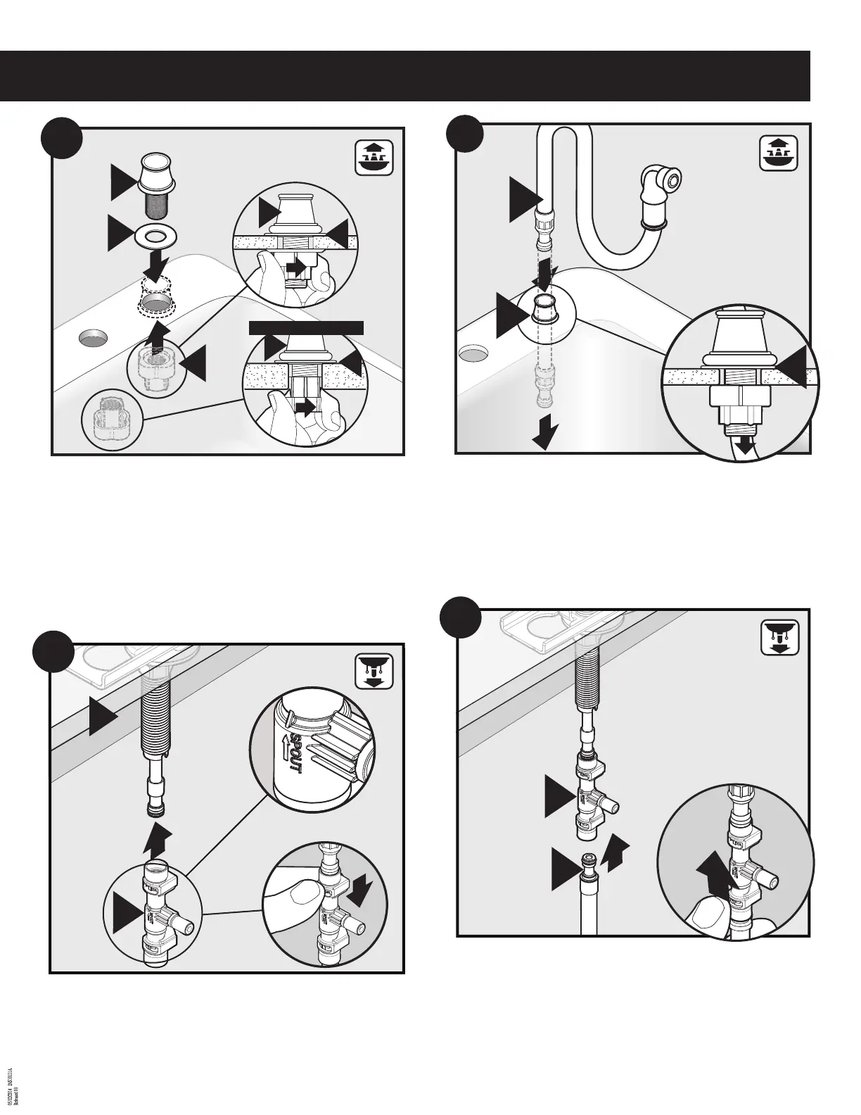 2. Thread Hose Guide Nut (J) onto Hose Guide (H) from below sink deck.
