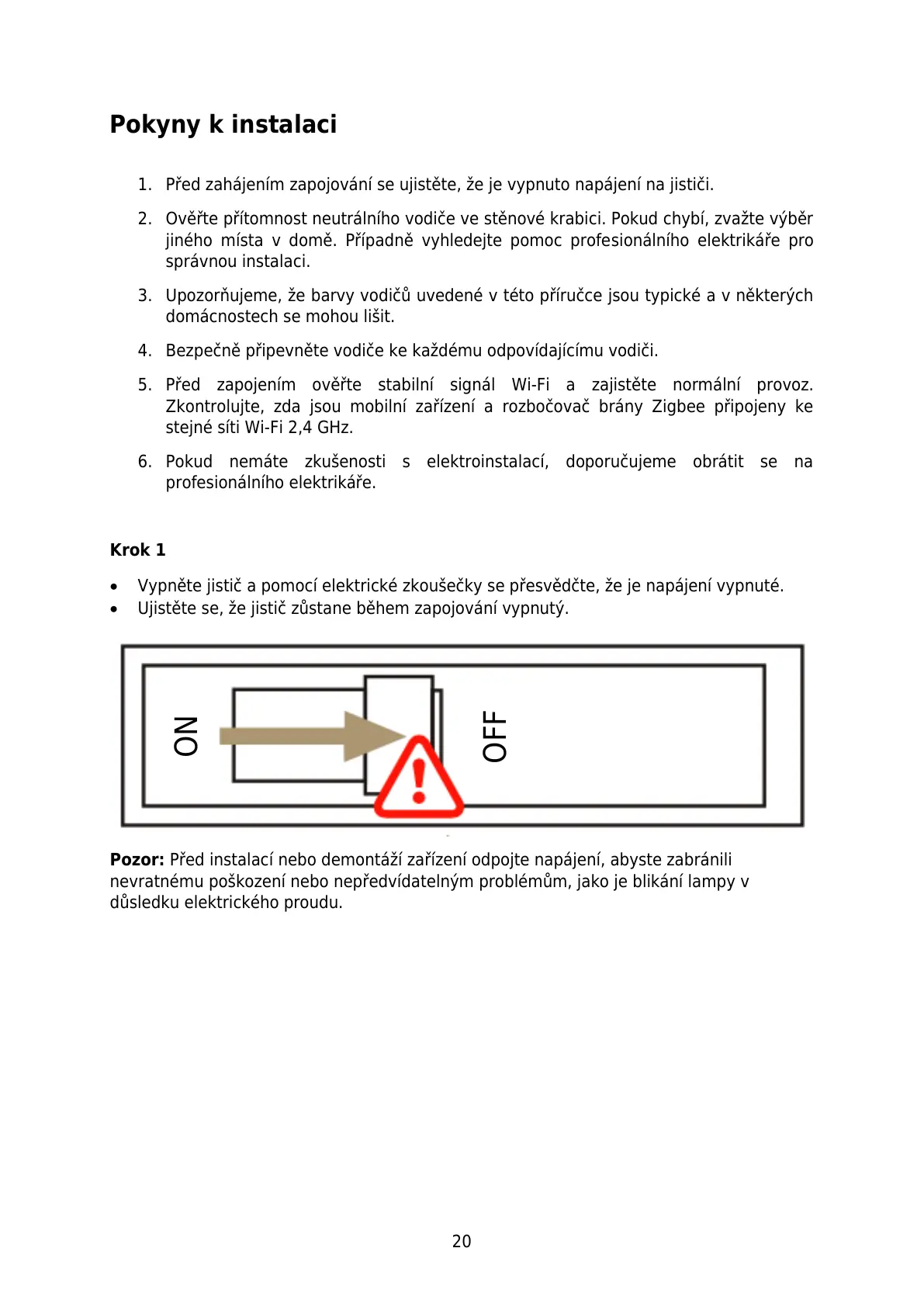 1. Před zahájením zapojování se ujistěte, že je vypnuto napájení na jističi.