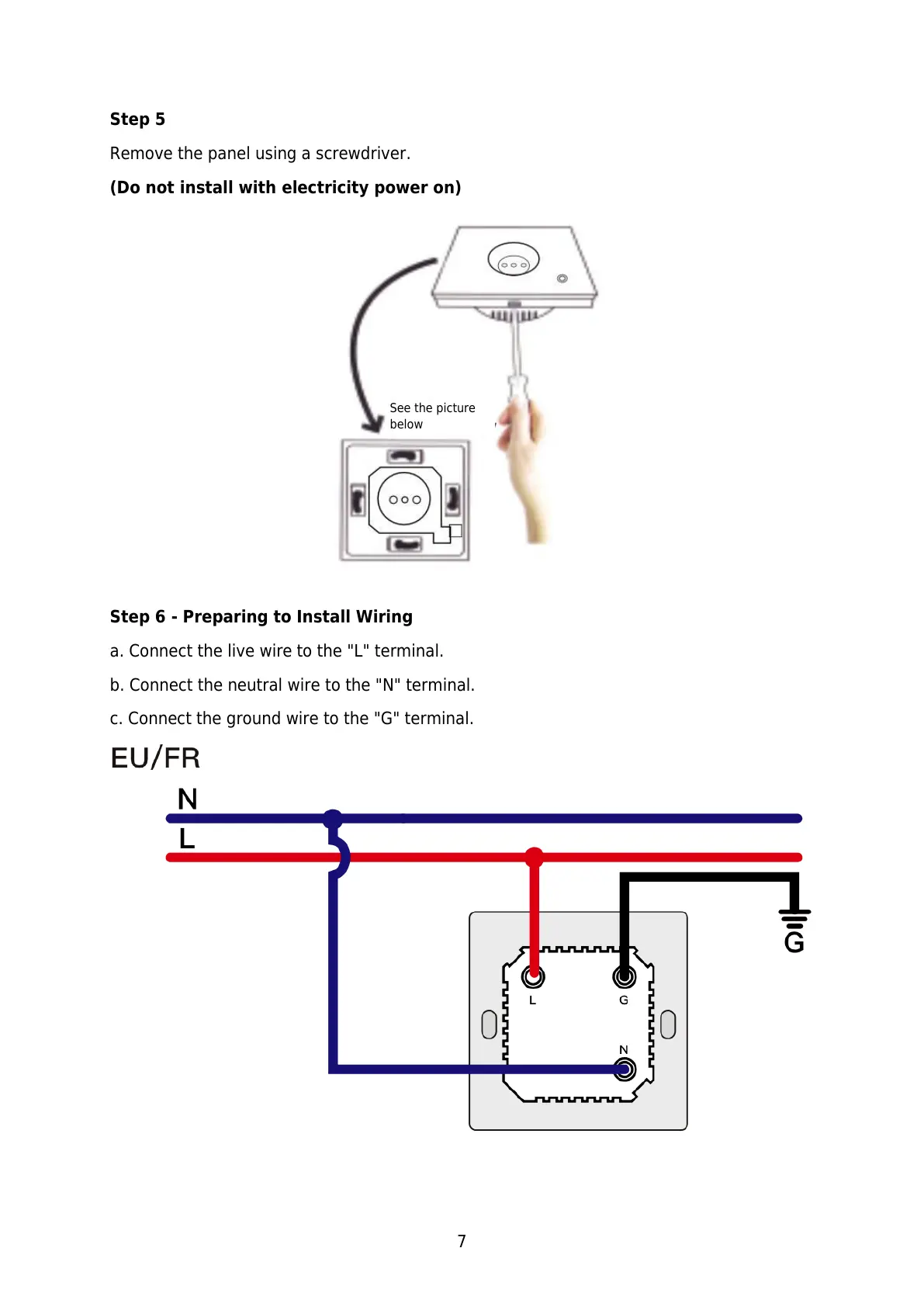 a. Connect the live wire to the "L" terminal.