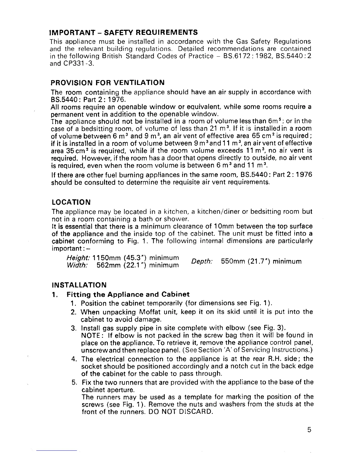 Moffat 3000 DL - Safety Requirements; Provision for Ventilation; Location; Installation