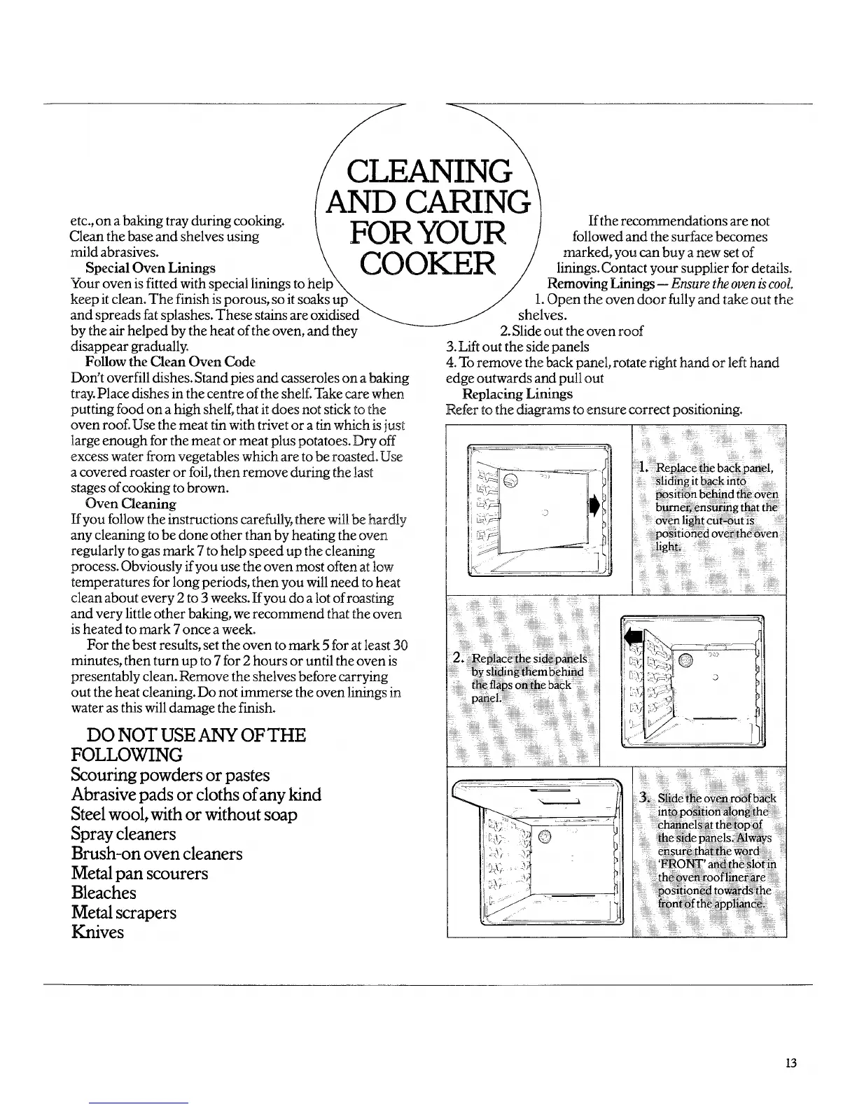 Moffat DISCOVERY - COOKER MAINTENANCE AND CARE; Special Oven Linings; Clean Oven Code and Prohibited Agents; Removing and Replacing Linings