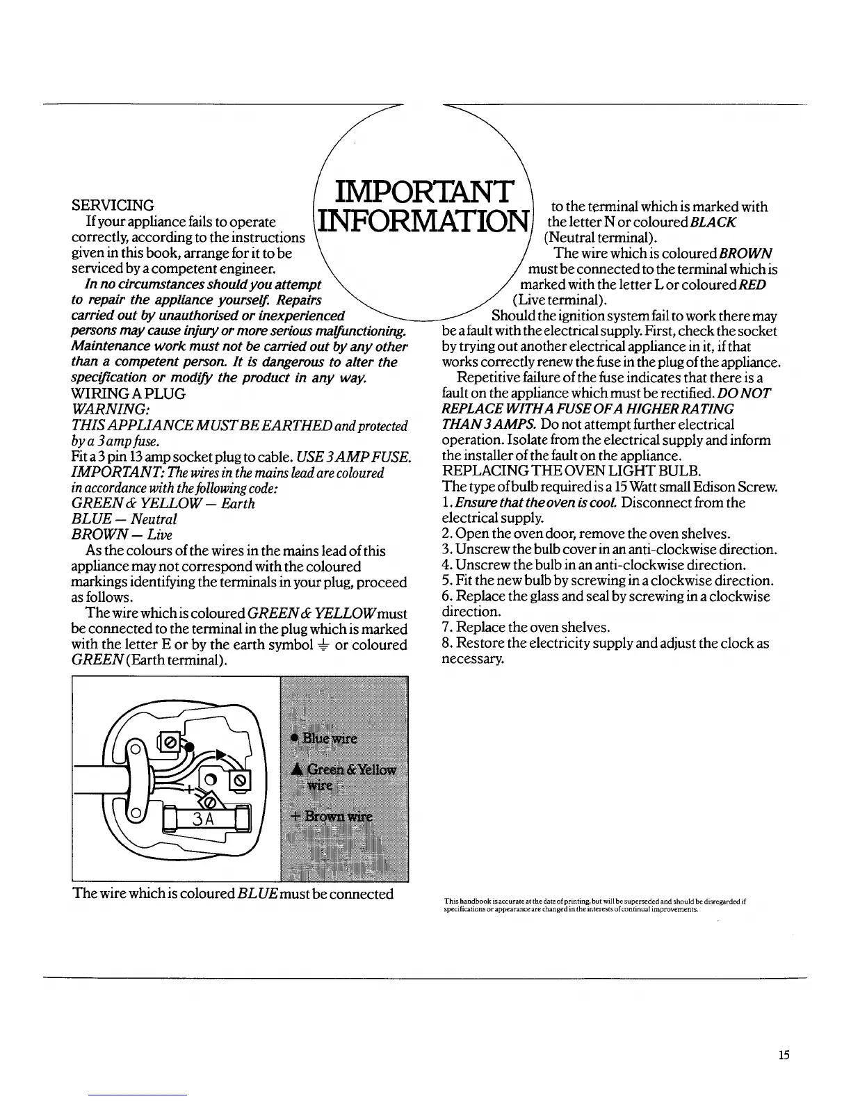 Moffat DISCOVERY - IMPORTANT INFORMATION; Servicing and Repairs; Wiring a Plug; Replacing Oven Light Bulb