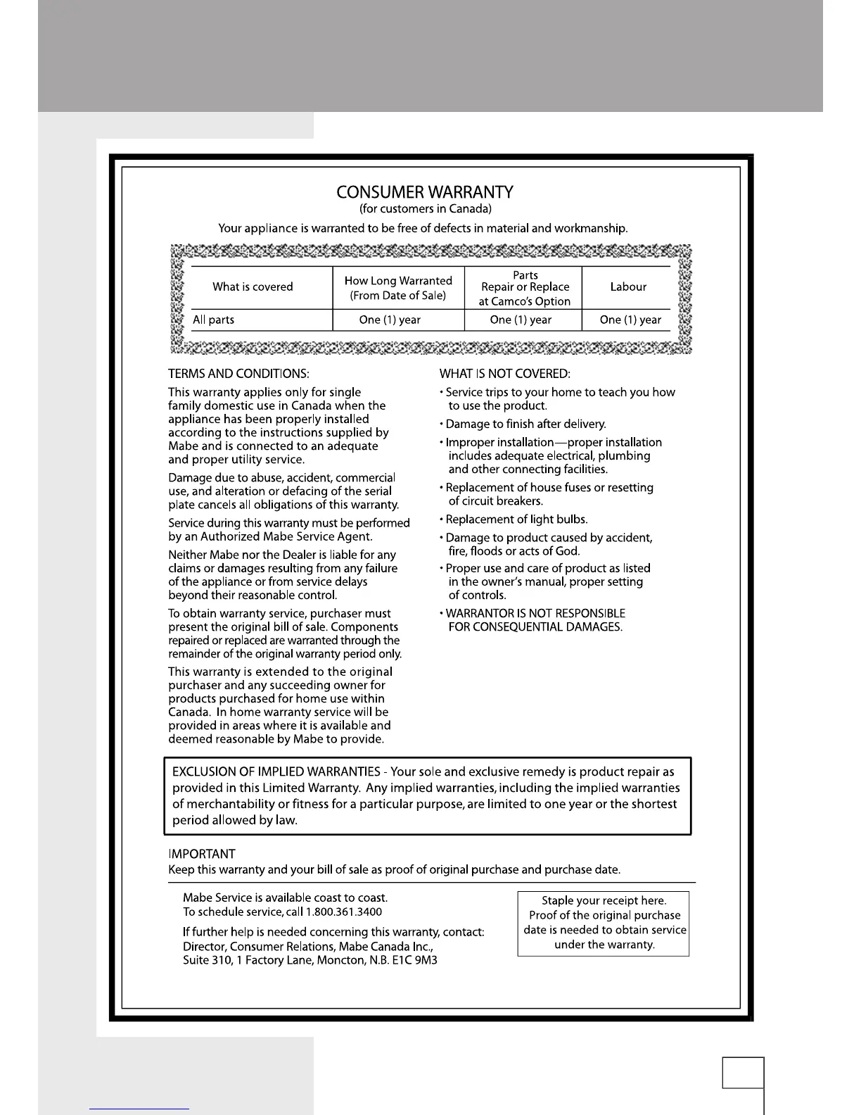 Moffat Washing machine - Consumer Warranty Details; Warranty Coverage Details; Warranty Exclusions and Limitations; Warranty Service and Proof of Purchase