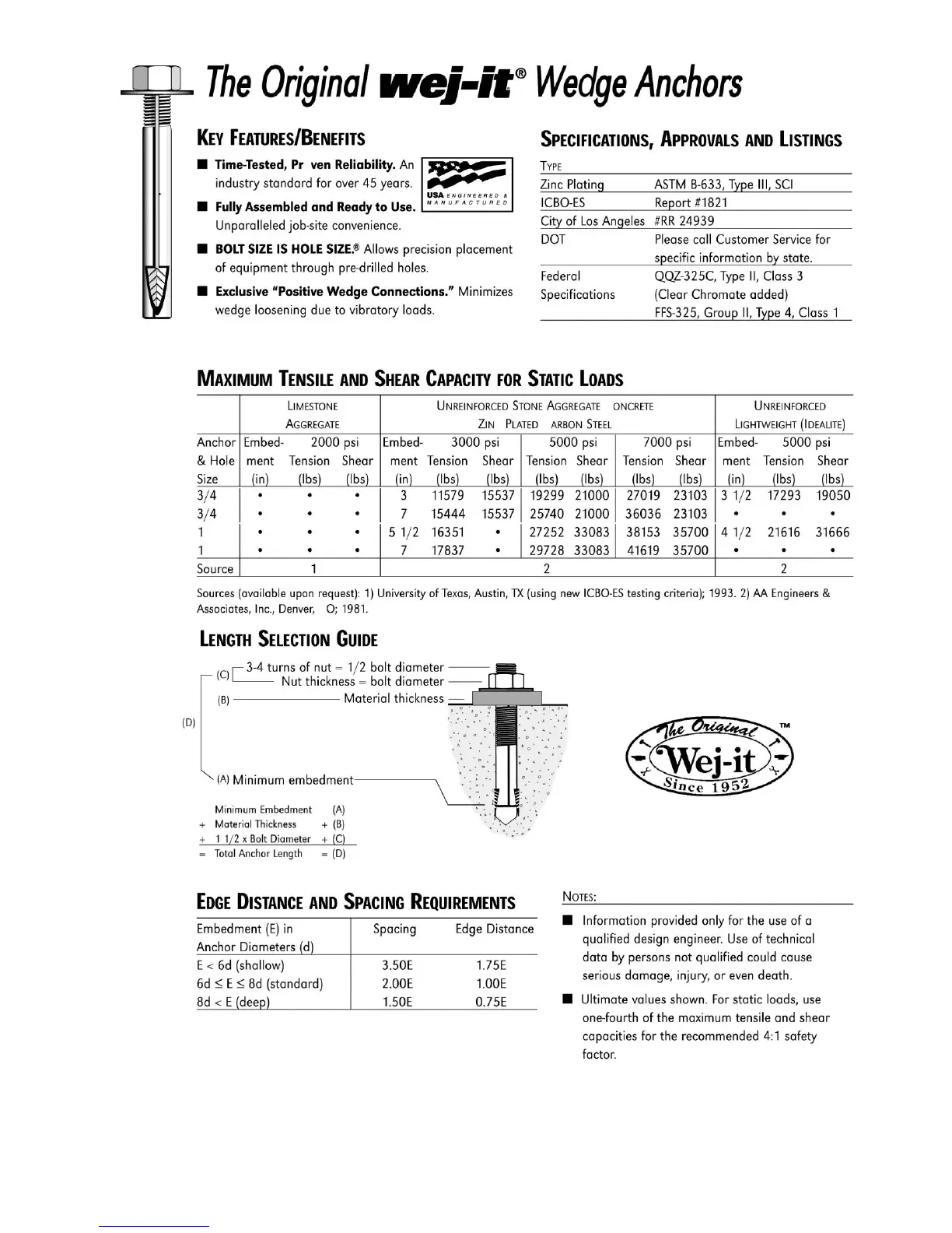 Mohawk IA - Length Selection Guide; Key Features;Benefits; Maximum Tensile and Shear Capacity for Static Loads; Specifications, Approvals and Listings