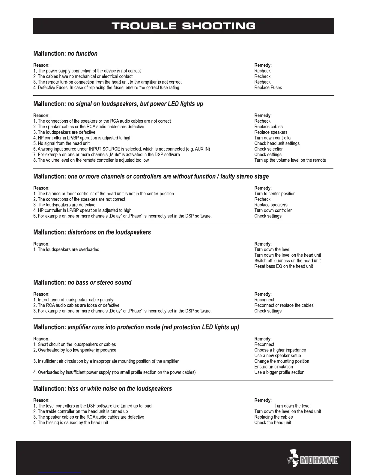 Mohawk MC 300.4DSP - Trouble Shooting; Common Malfunctions and Remedies