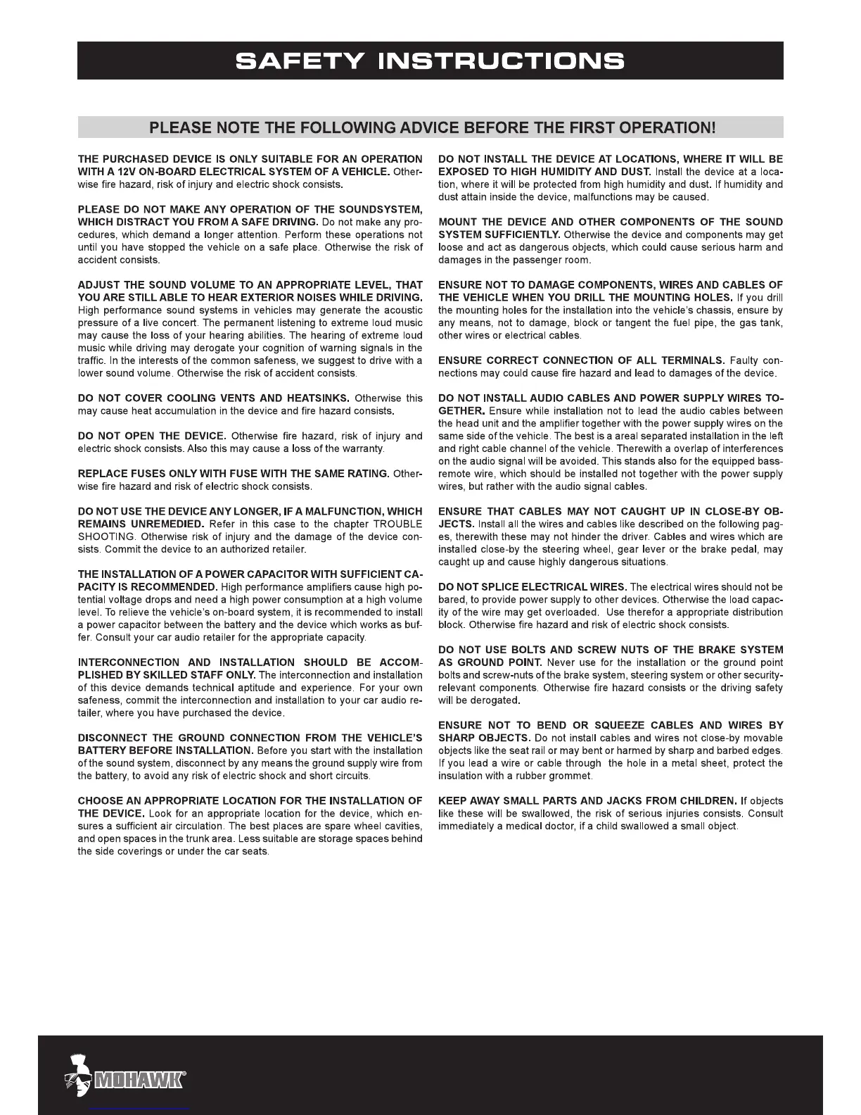Mohawk MC 300.4DSP - Safety Instructions; Device Handling and Operational Safety; Installation and Wiring Safety; Electrical System Precautions