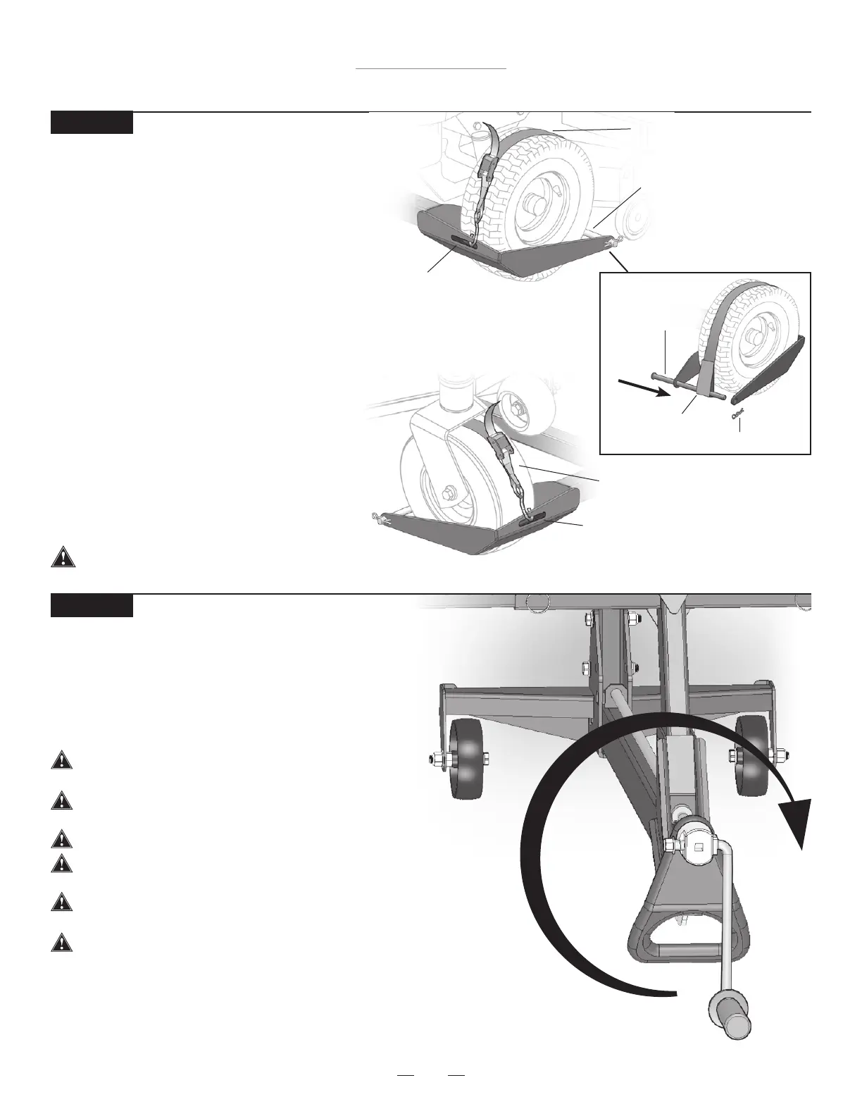 • Asegurar las llantas frontales de la cortacésped a las
