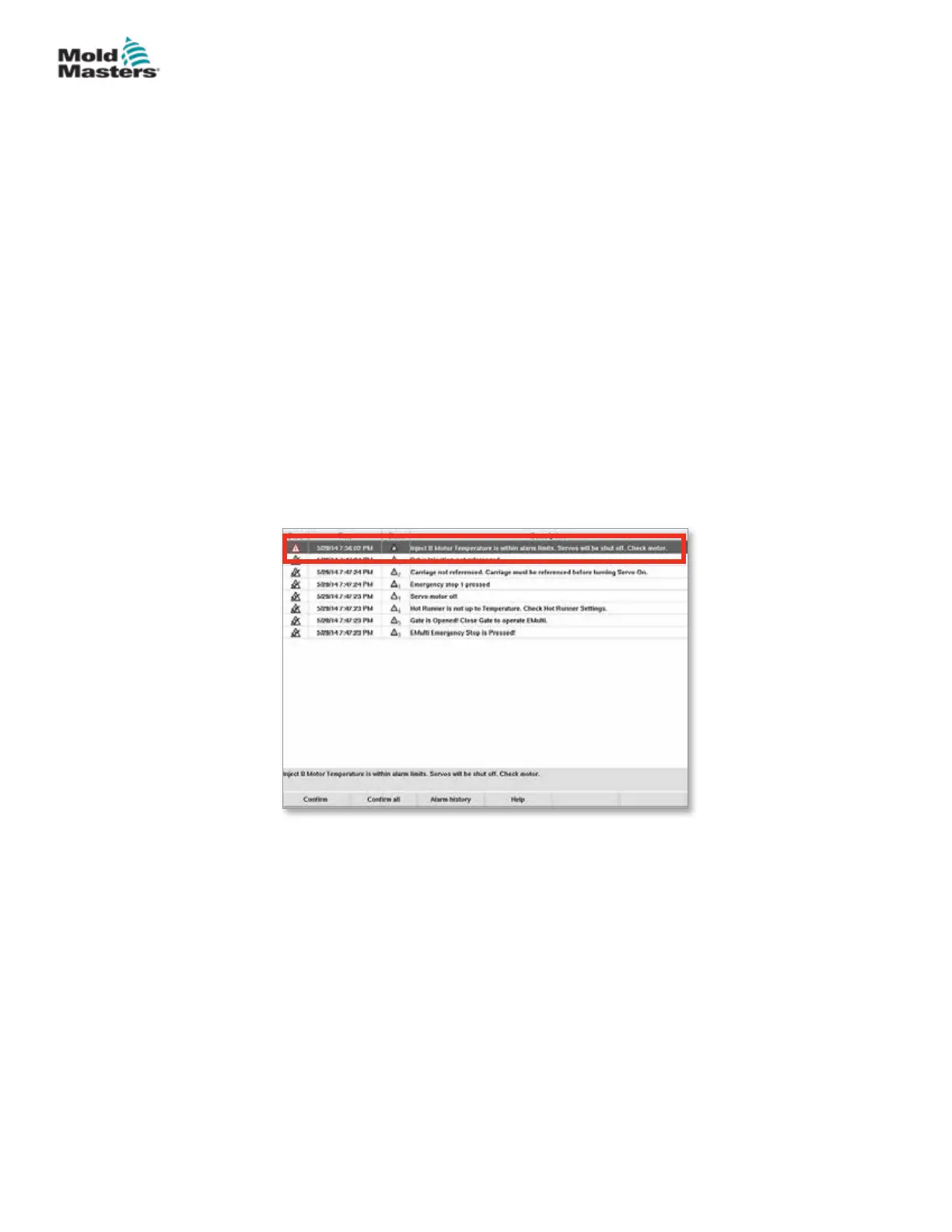 Figure 9-1 Alarms screen with motor temperature alarm