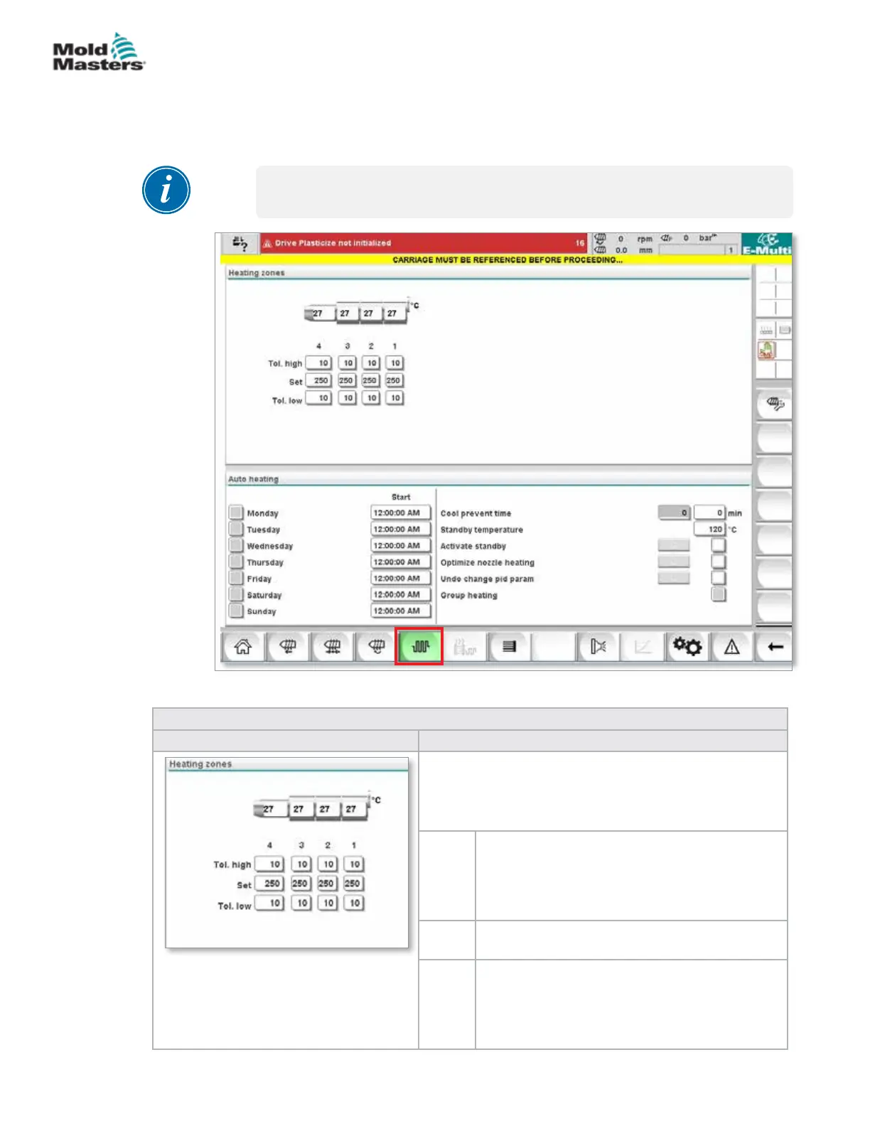 This screen is used to adjust temperature settings for the barrel heating