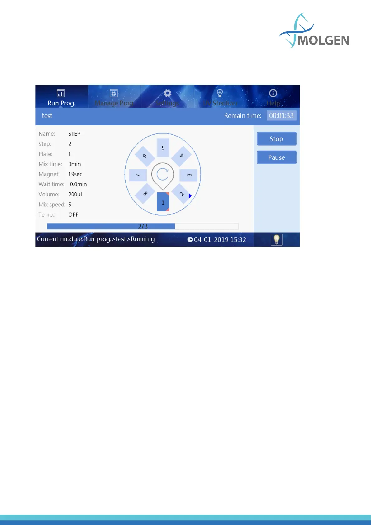 In the running interface, users can stop, pause, continue or run the program again. Plate number 1