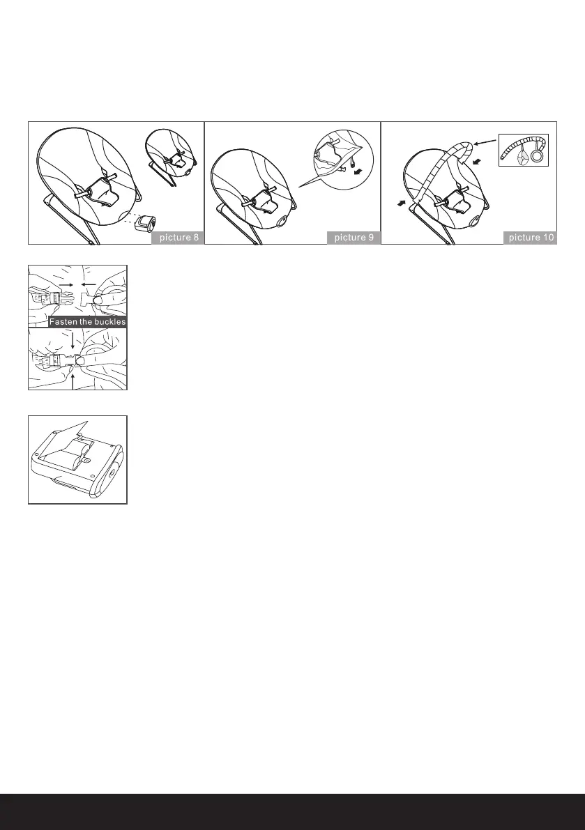 8. Clip the toy bar to each side of the bouncer franne(10). Pull the clip off to remove the toy bar.