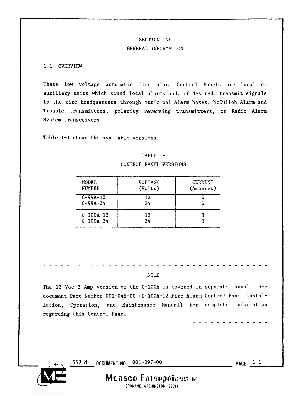 document Part Number 001-045-00 (C-100A-12 Fire Alarm Control Panel Instal-
