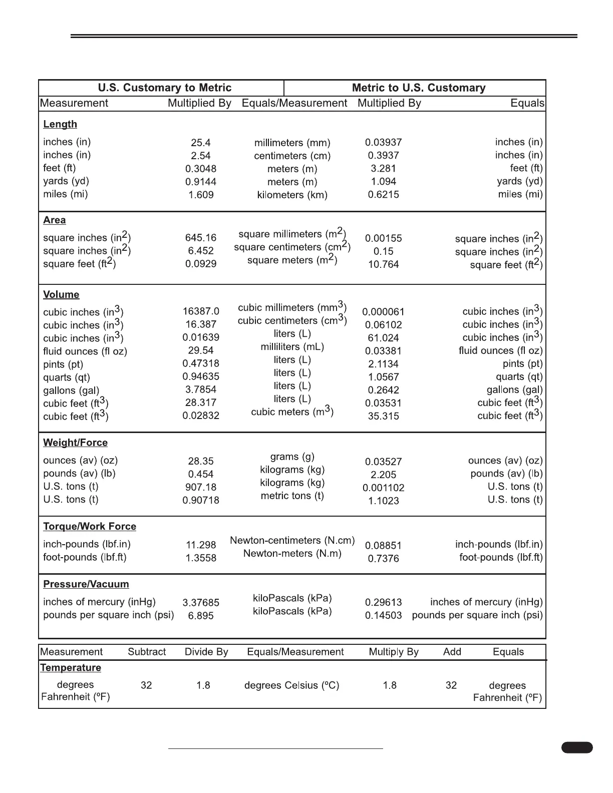 METRIC/U.S. CONVERSION CHART