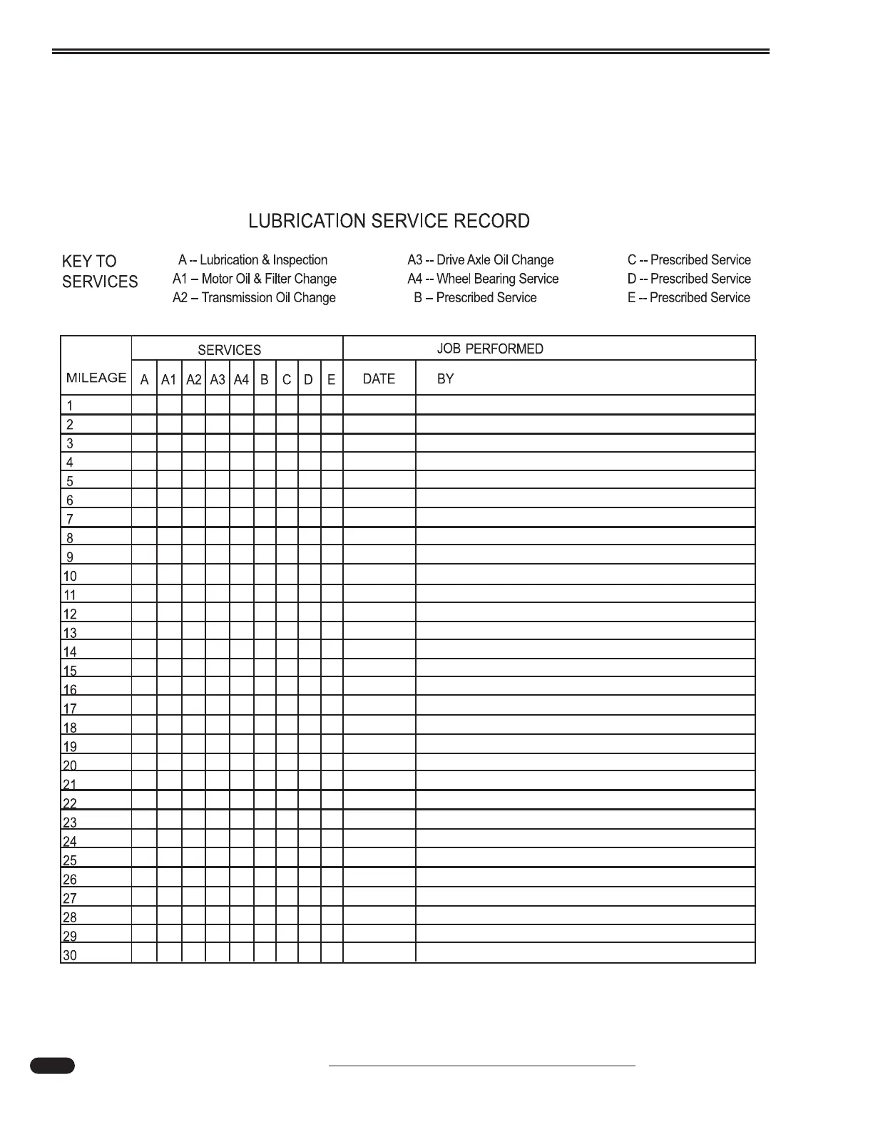 After scheduled services are performed, record the date, odometer reading and who performed the