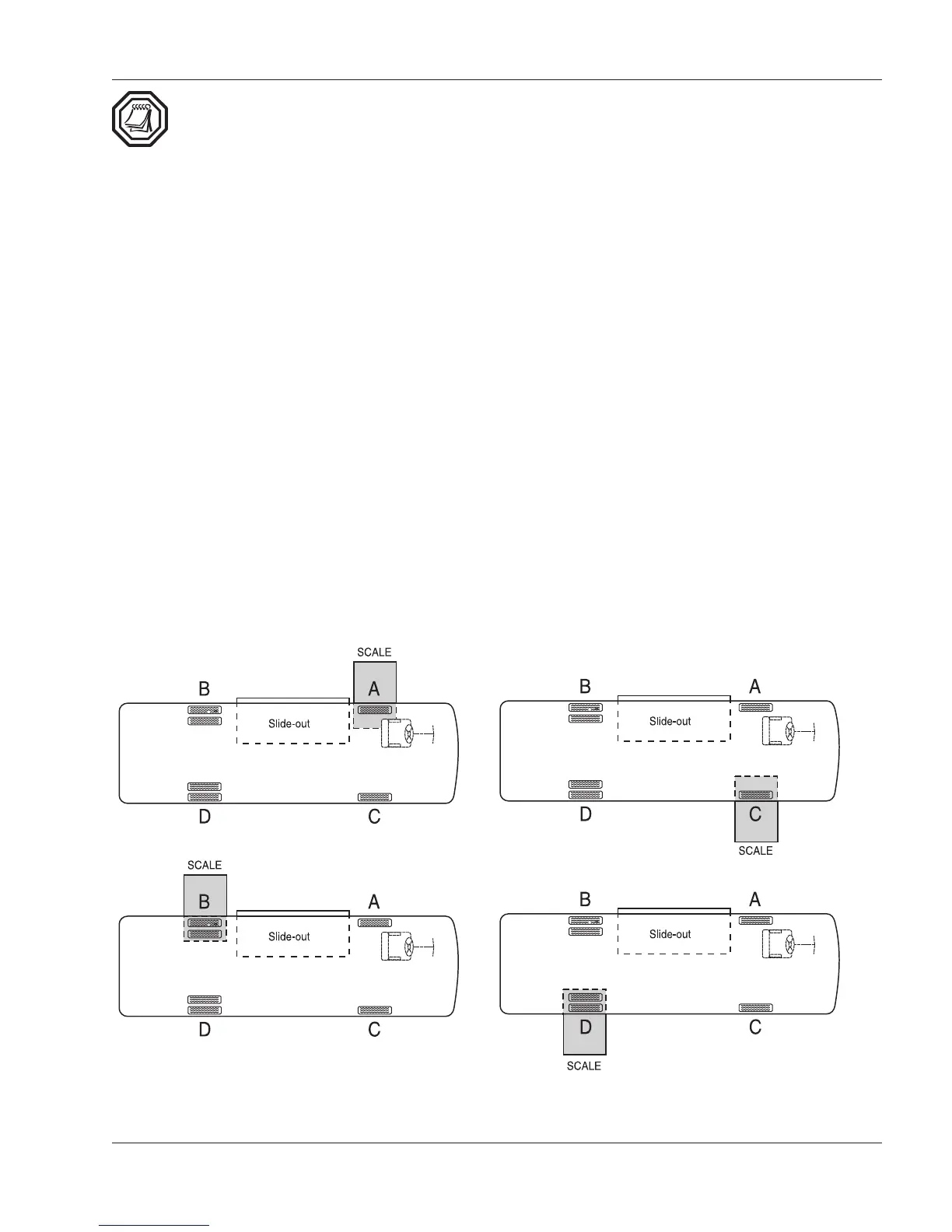 • Weigh the passenger side rear corner (Scale D) and record weight on