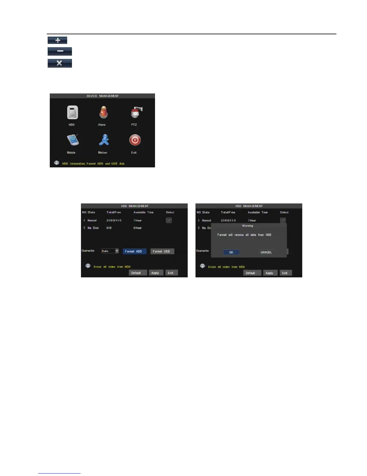 If HDD need to be formatted, status will be shown as “no format”, otherwise, the HDD status will be shown