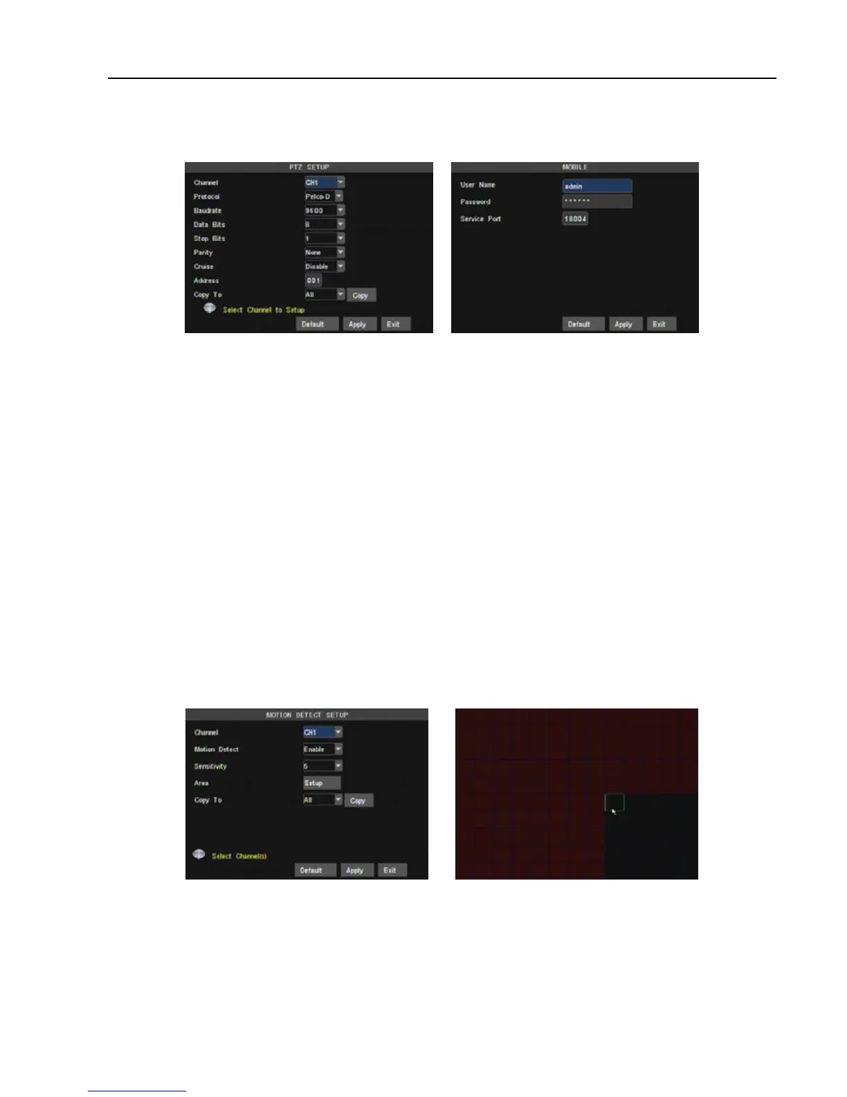The [Motion detection] Menu has three sections, including Channel Status, Sensitivity and Motion area.