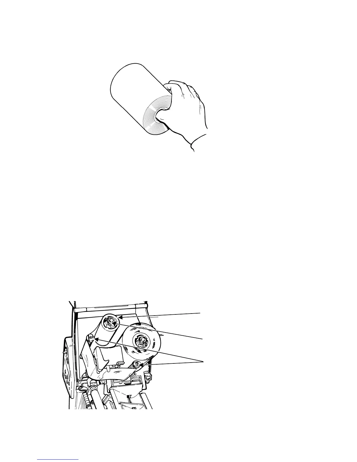 8. Carefully feed the ribbon under both ribbon rollers and printhead as