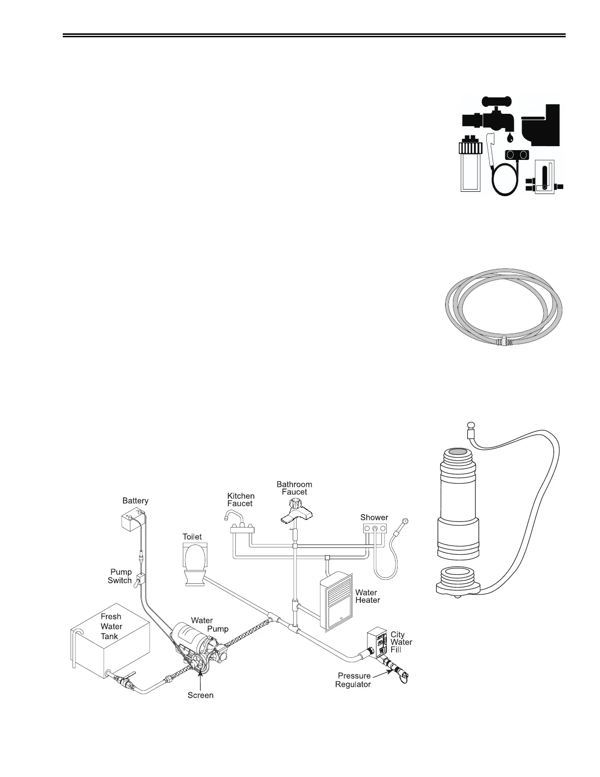 tank, water pump, gravity fill water filter and a city/fresh water connection. For