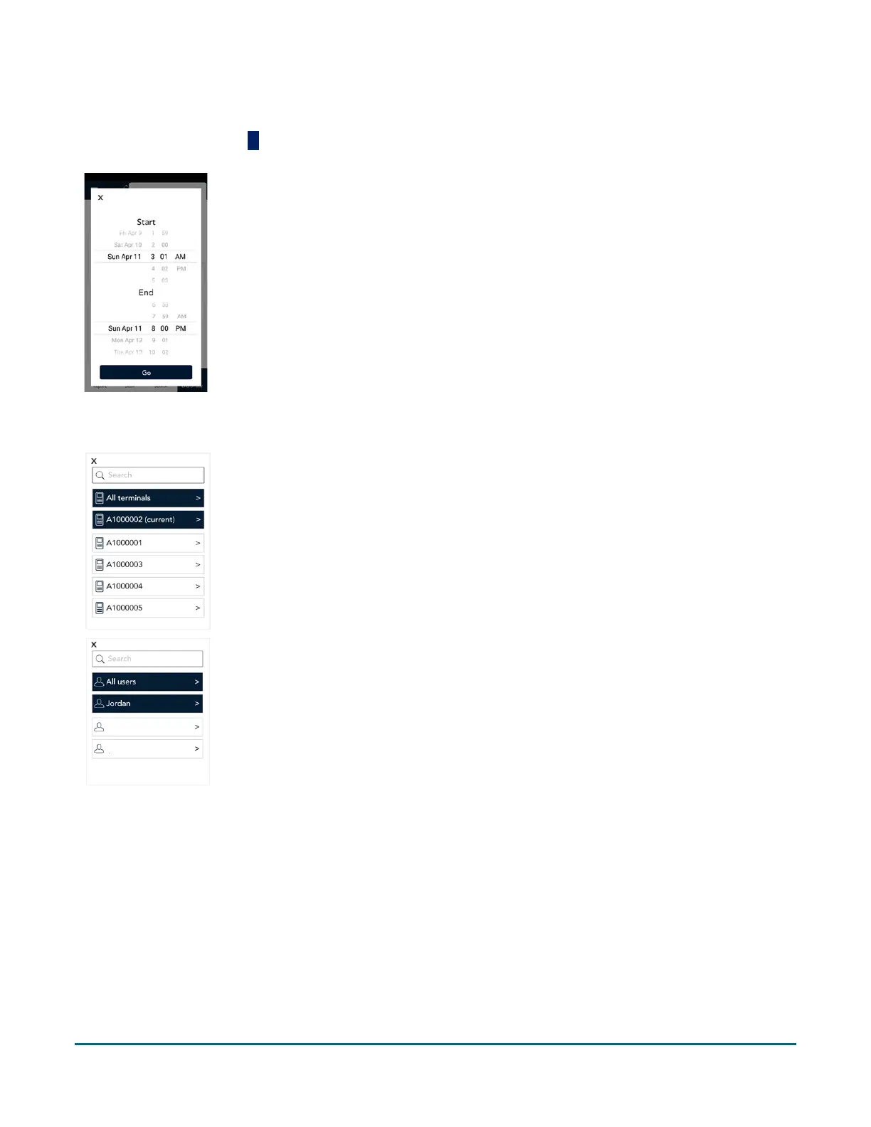 Tap the additional options ⋮ icon to access the Time and date, User, and Terminal filters to create a customized