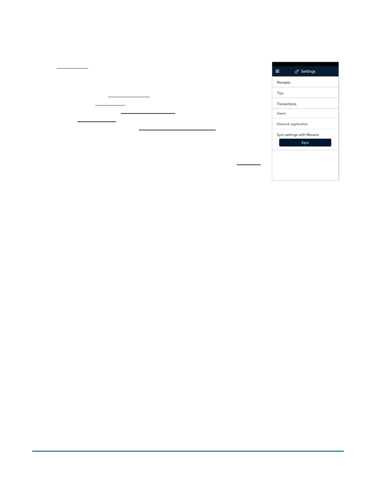 Sync settings with Moneris. Tap Sync to synchronize all settings with