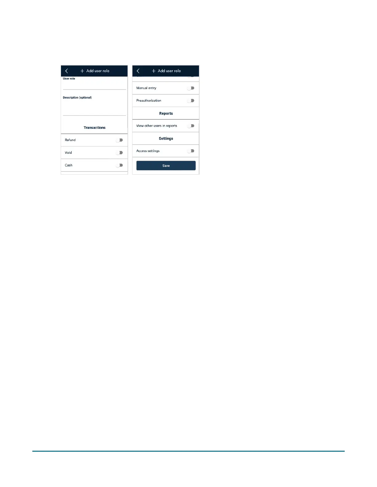 c. Transactions, Reports, and Settings. Tap the toggle beside each option to