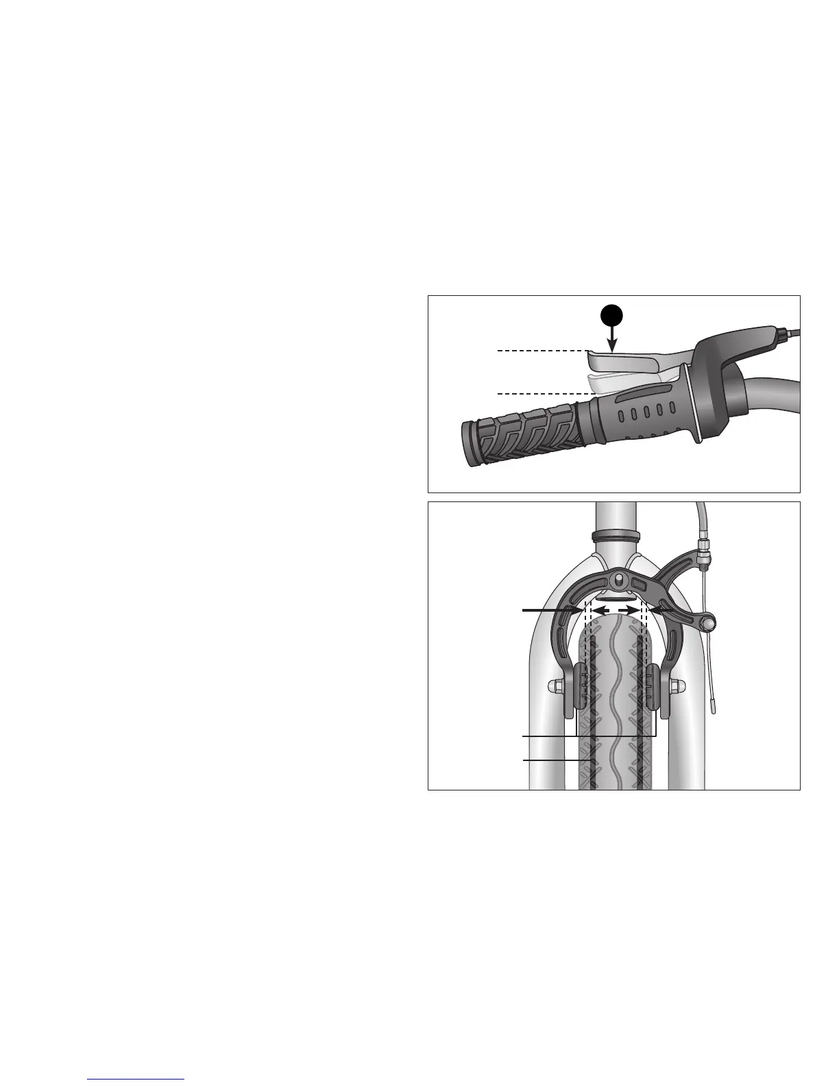 • Both brake pads move away from the rim equally when the