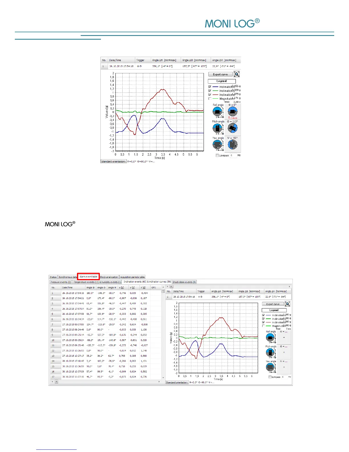 inclination events/inclination curves, and shock alarm events). With the corresponding