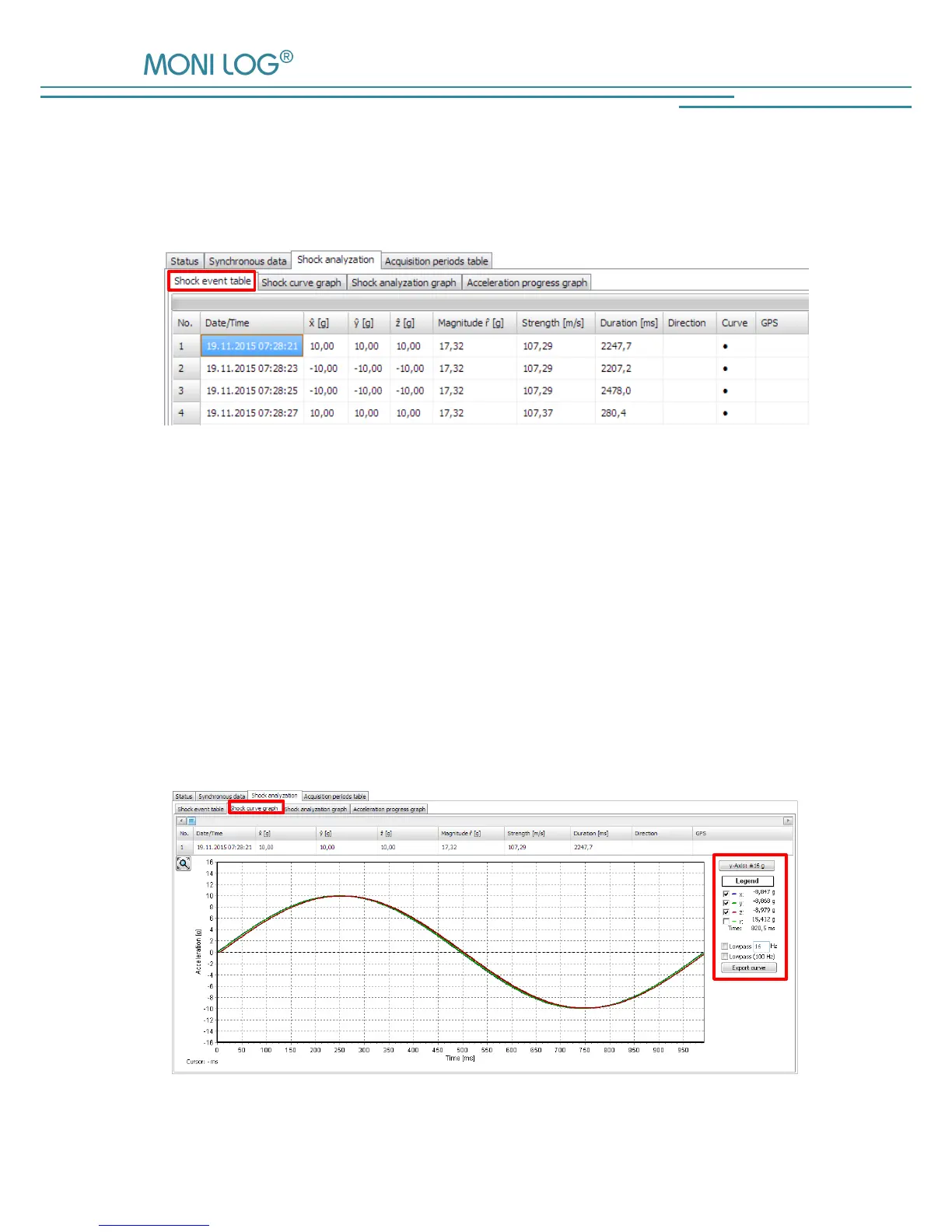 In the programme tab “Shock curves graph” the recorded shock curves are shown as a graph. By