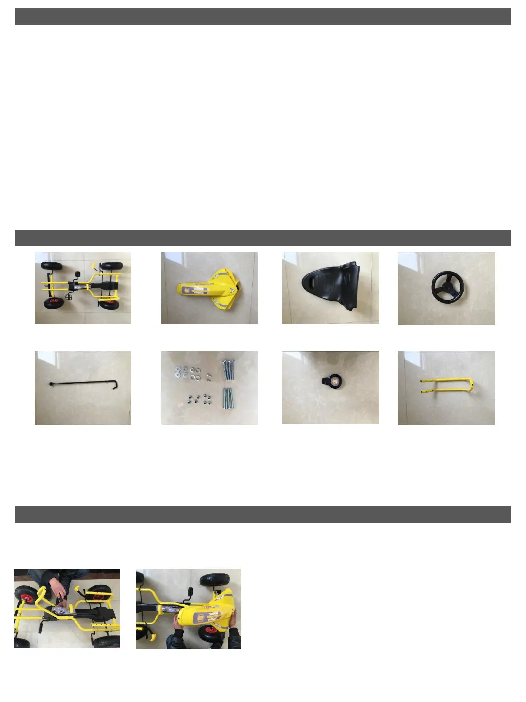 The assembly of the pedal kart must be performed by an adult. Follow the instructions and