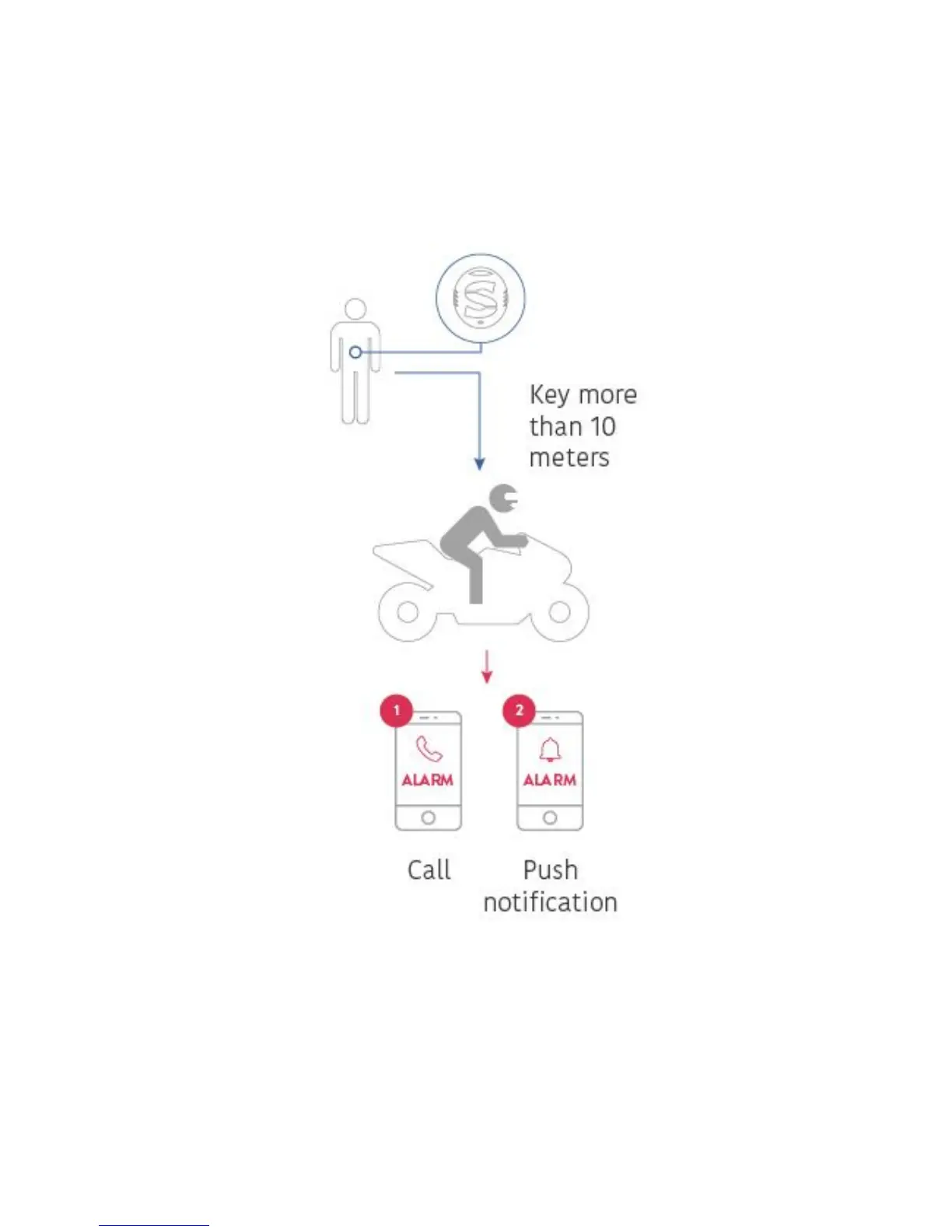 When Monimoto senses any type of motion, movement or vibration it will check if KEY is around. If